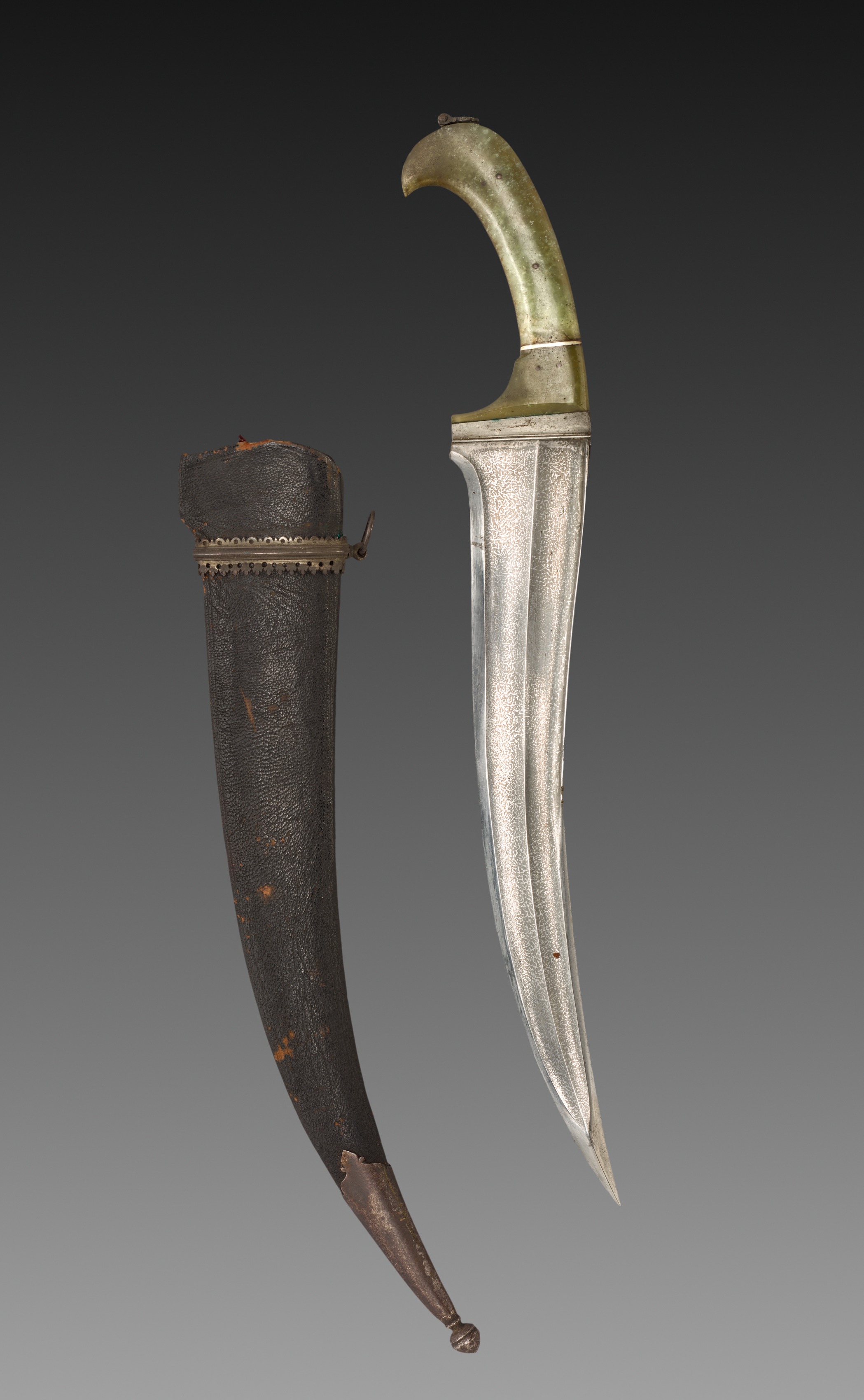 Knife with jade handle and scabbard by Artist: Curved knife with jade handle, silver blade; long, curved blade with pointed tip; jade handle in green color; Scabbard made of dark brown leather, long and curved; small metal band at top; decorative metal trim; small metal knob at bottom; background transitioning from black to gray.
