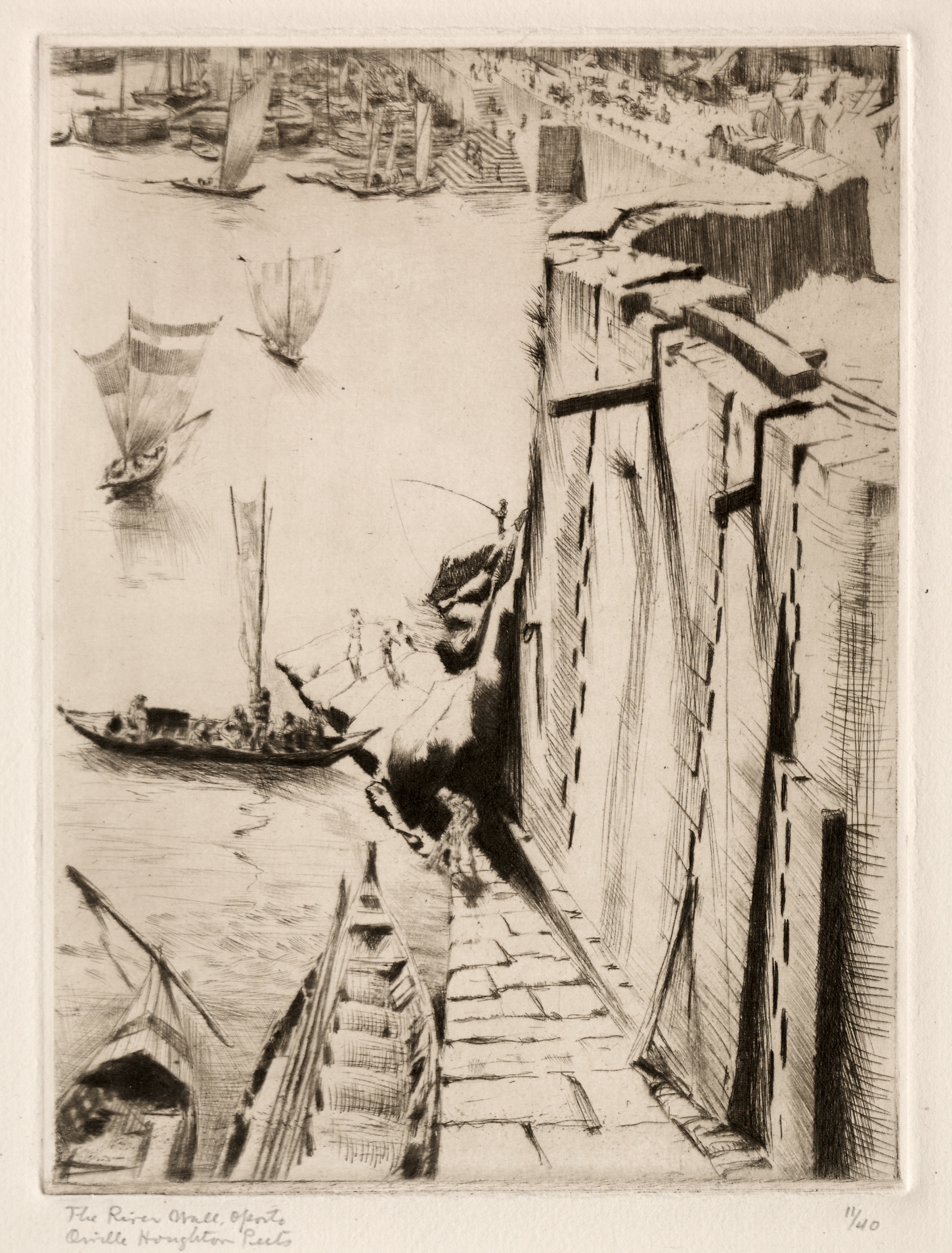 The River Wall, Oporto by Orville Houghton Peets: A black and white sketch depicting a river wall along a body of water. A brick walkway borders the wall on the right. A boat floats on the water. Several more boats are seen on the water along with a distant shoreline. A windmill-like structure is at the bottom left.