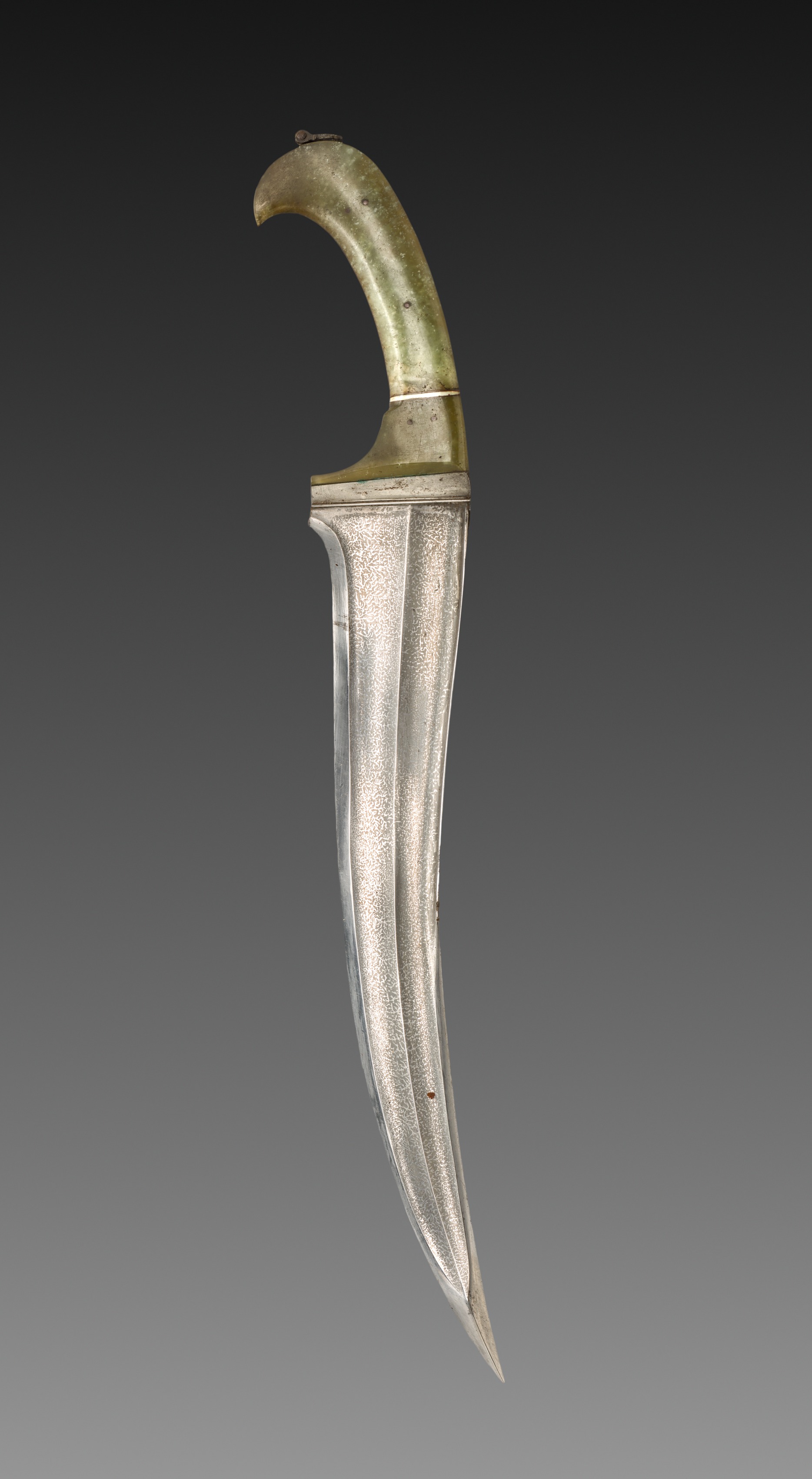 Knife with Jade Handle by an unknown artist. The knife has a curved jade handle. The jade is a greenish color with small brown spots and a darker green band at the base. A thin metal band separates the handle from the blade. The blade is long and curved with a sharp point. It is made of a shiny silver metal with a textured surface. The background is a gradient from dark gray at the top to light gray at the bottom.