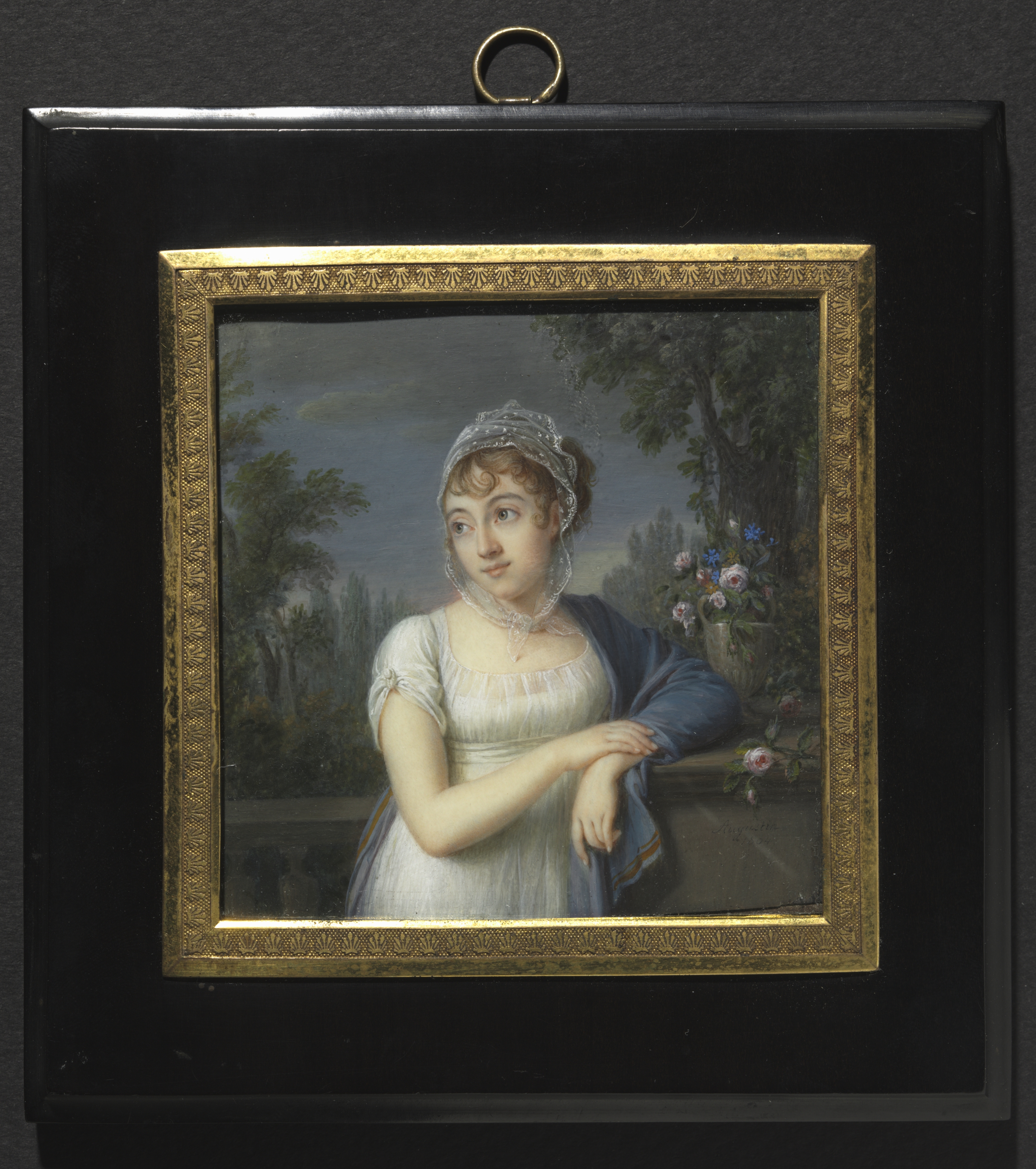 The painting depicts a woman standing in front of a balustrade. She wears a white dress with short sleeves and a blue shawl draped over her left shoulder. Her right arm rests on the balustrade. A transparent lace or netting covers her head. The background features trees, flowers, and a cloudy sky. The portrait is framed in gold and encased in a black frame.