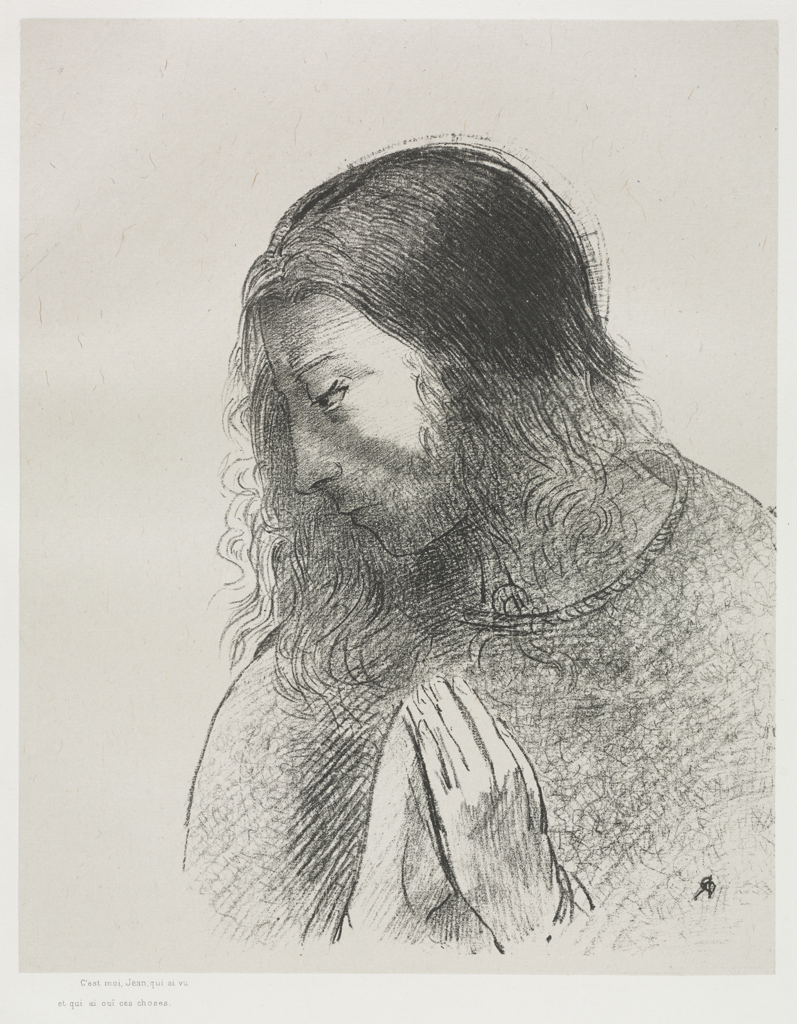 Black and white drawing of a man with long hair and a beard, looking down with his hand raised to his chest. The man is wearing a shirt with a collar. The background is off-white. The text at the bottom left reads "C'est moi, Jean, qui ai vu et qui ai ouï ces choses." The image is a portrait titled "And I John Saw These Things, and Heard Them" by Odilon Redon.