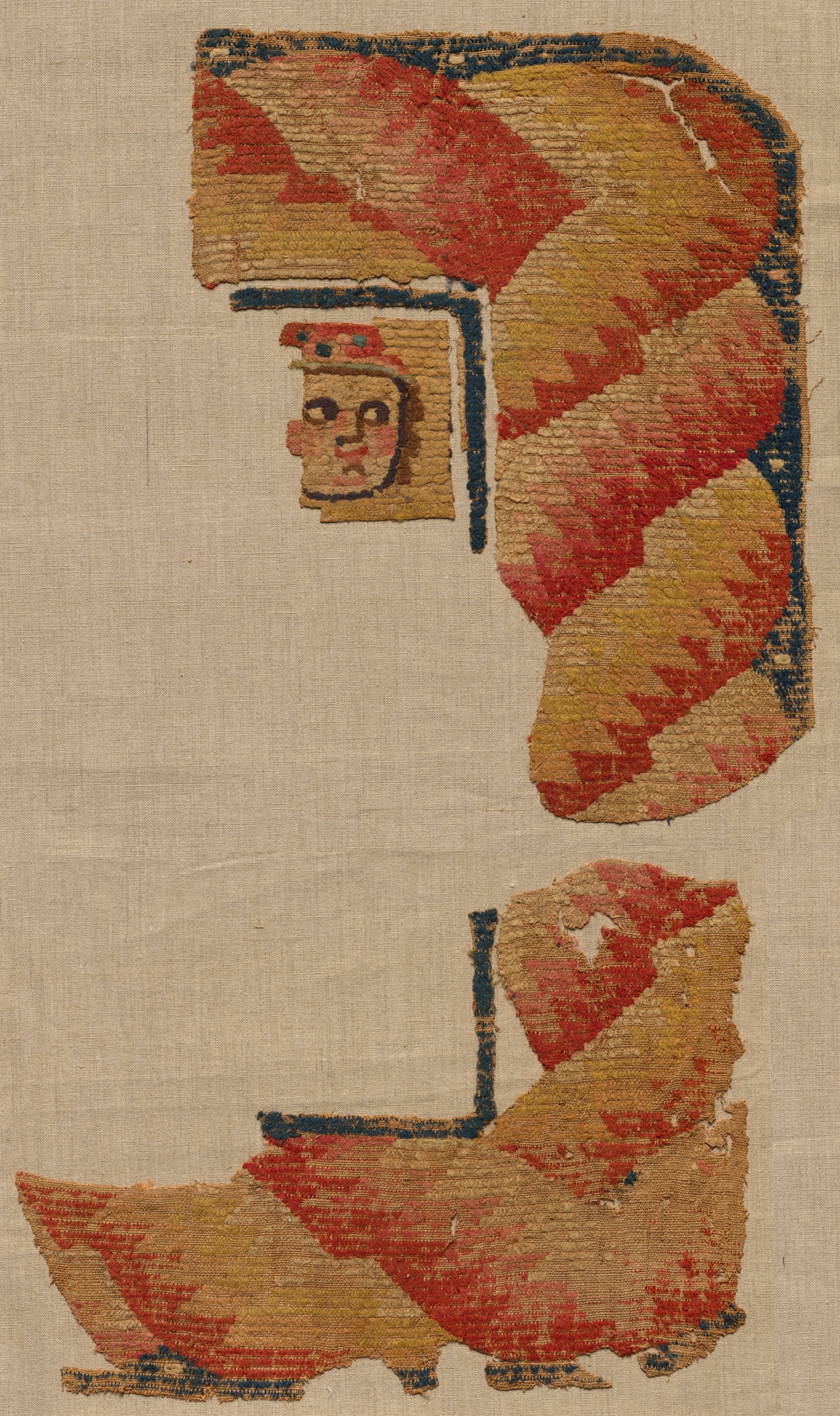 The image is a fragment of a textile, likely a curtain, with a predominantly beige background. The fragment features two curved sections with red and gold diagonal stripes and a black outline. A small, square section with a face is attached to the top curved section on the left side. The face has a red hat, pink cheeks, and black eyes. The top curved section is positioned vertically, while the bottom curved section is positioned horizontally. Both sections have a rough, frayed edge. The overall appearance suggests an ancient or vintage textile, possibly from an unknown artist. The title of the piece is "Fragment, Probably an Ornament from a Large Curtain."