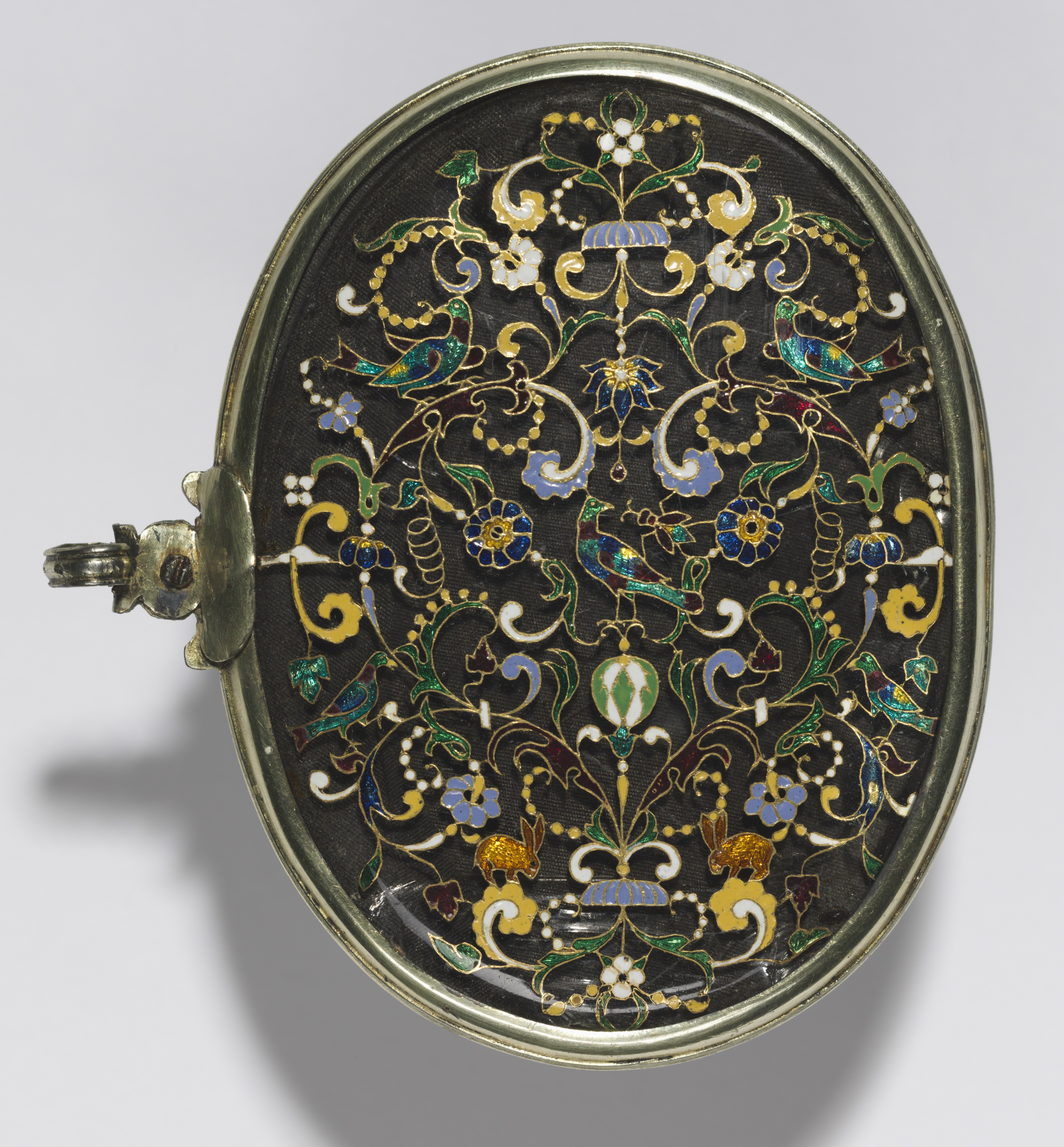 Oval-shaped object with a gold-colored metal rim and a hinge on the left side. Black background with intricate floral design featuring blue, green, white, and yellow colors. The design includes birds, flowers, and vines. The object appears to be a compact mirror by artist Louis Comfort Tiffany.