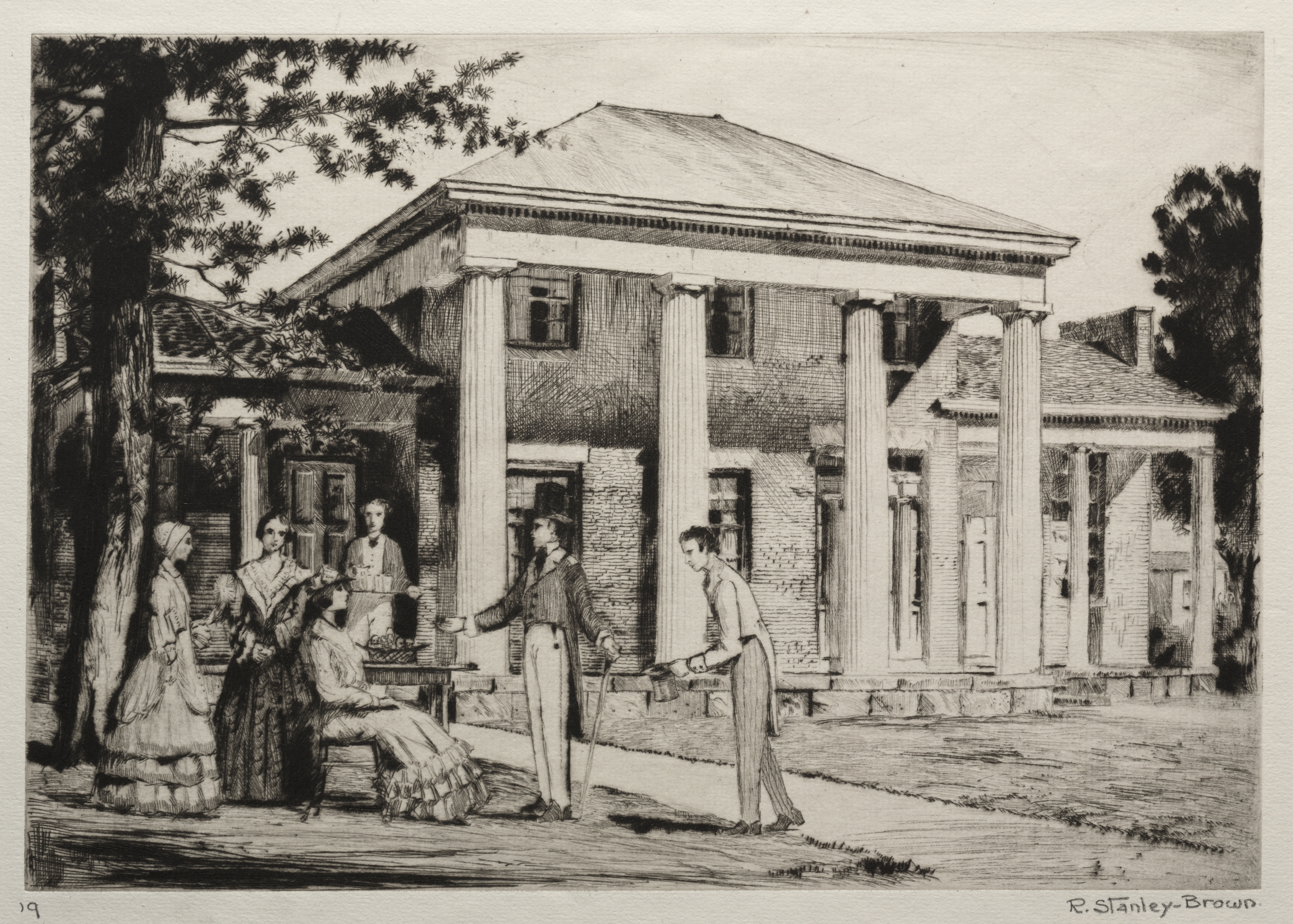 The Fifties by Rudolph Stanley-Brown: Black and white drawing of a scene depicting people standing and sitting in front and beside a building with a wide porch supported by columns. The building has a brick exterior and a gabled roof. A large tree trunk is on the left. The people are dressed in clothes typical of the mid-19th century, with women wearing dresses and men in jackets and pants. A man in a hat and coat stands with his arm extended to another man in a hat and apron-like clothing. A woman sits on a bench beside a woman standing and another woman standing to their left. A man sits on a porch. A tree silhouette is on the right.