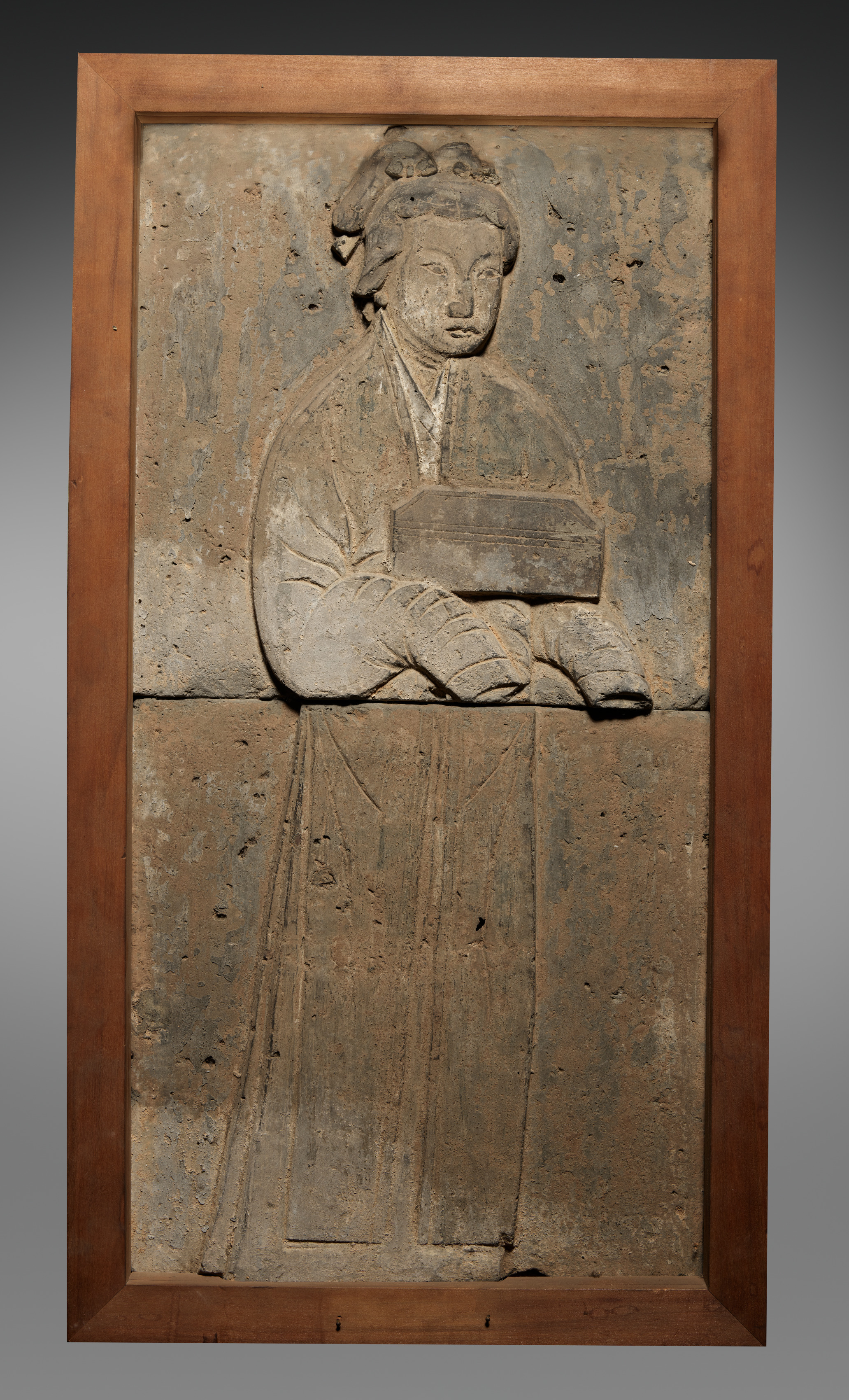 Relief of a Woman by Auguste Rodin. A rectangular stone relief sculpture of a woman in a wooden frame. The sculpture is of a woman facing right with hair pulled back. She wears a robe with a high neckline. Her hands are clasped holding a book in front of her waist. The woman's face is expressionless. The stone is gray with darker gray and brown patches. Small holes are scattered throughout. The wooden frame is reddish-brown. The background behind the frame gradates from black to gray.