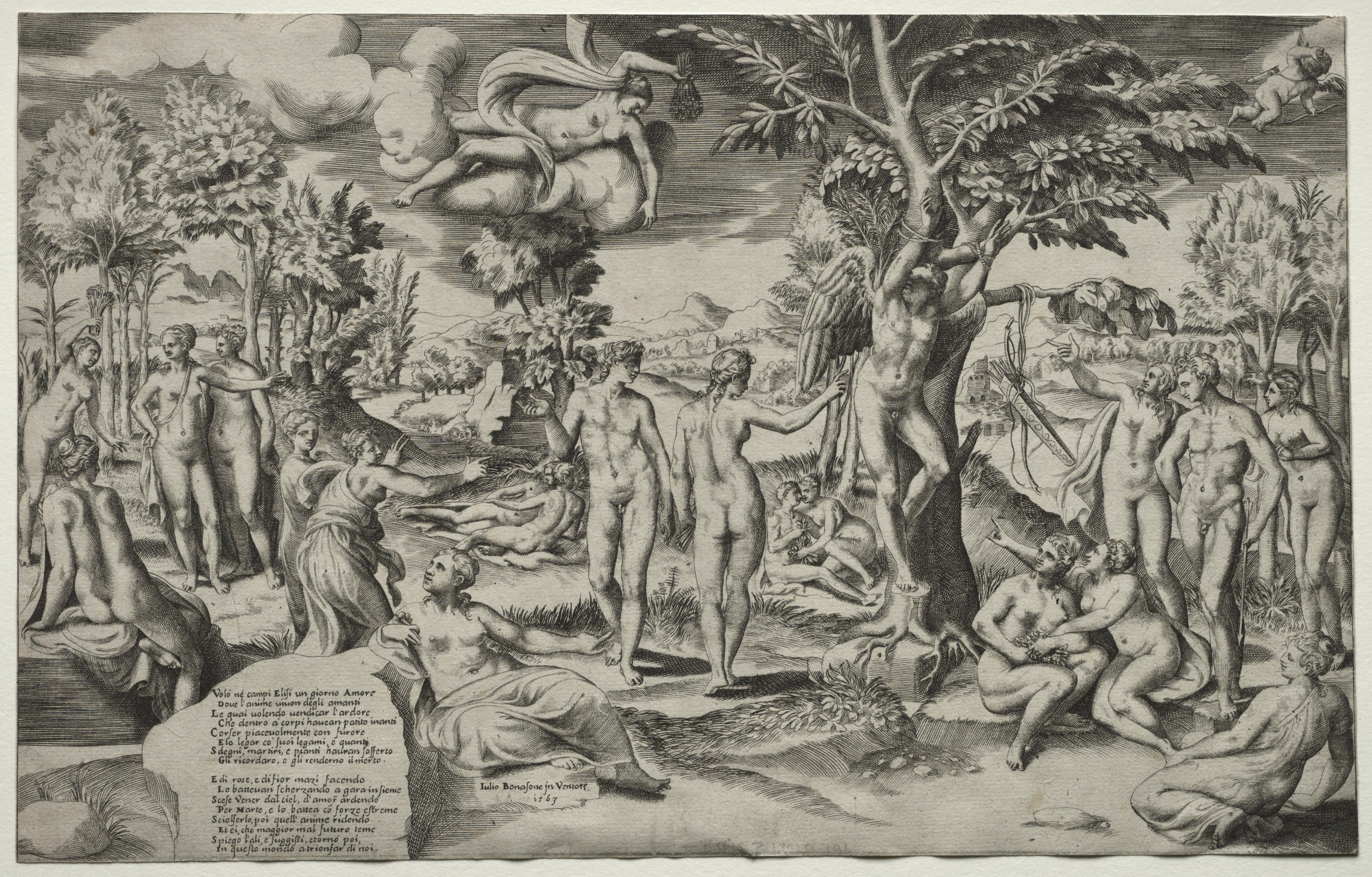 The image depicts a black and white engraving of a scene from a field with trees and a cloudy sky. The Elysian Fields scene with nude figures are gathered in a natural setting. A reclining figure sits on the bottom left, while a figure reclines on the ground behind her. Several nude figures stand around, some interacting with each other. A man with wings and a bow and arrow is visible on the right. A man hangs from a tree. A figure rides a cloud formation at the top. The bottom left features a block of text. The artist's signature appears at the bottom center. The background showcases trees, hills and a body of water.