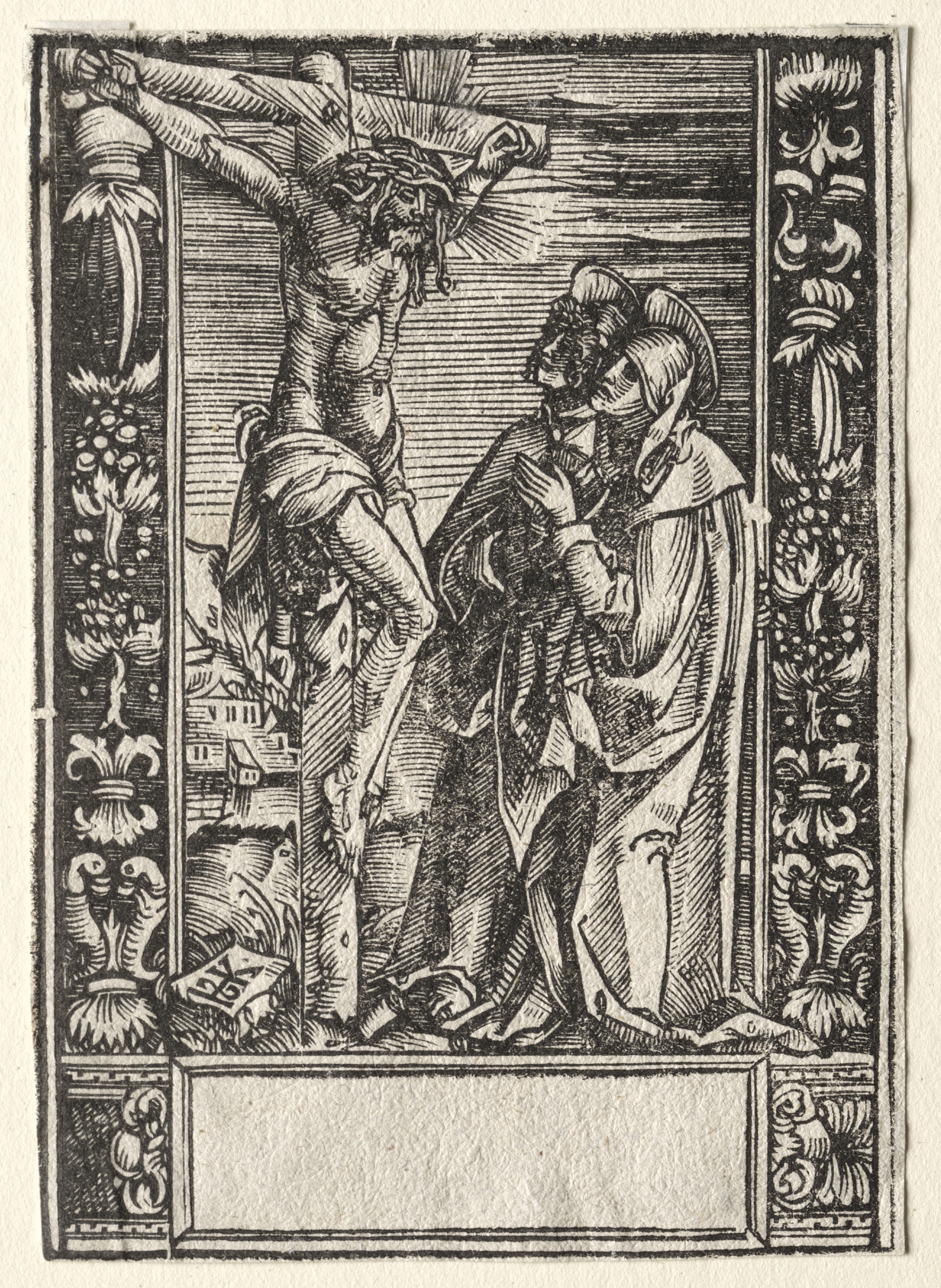 Black and white image of a man on a cross. The man on the cross has a crown on his head, a cloth wrapped around his waist, and his arms outstretched. The man on the cross has a long beard and hair. To the right of the man on the cross are a man and a woman. The woman wears a head covering. The man wears a hat. Behind the figures on the right is a dark background. Behind the figures on the left is a town and mountain range. The image has a decorative border. The border on the left includes a pineapple. The border on the right includes grapes. There is a blank rectangle at the bottom.