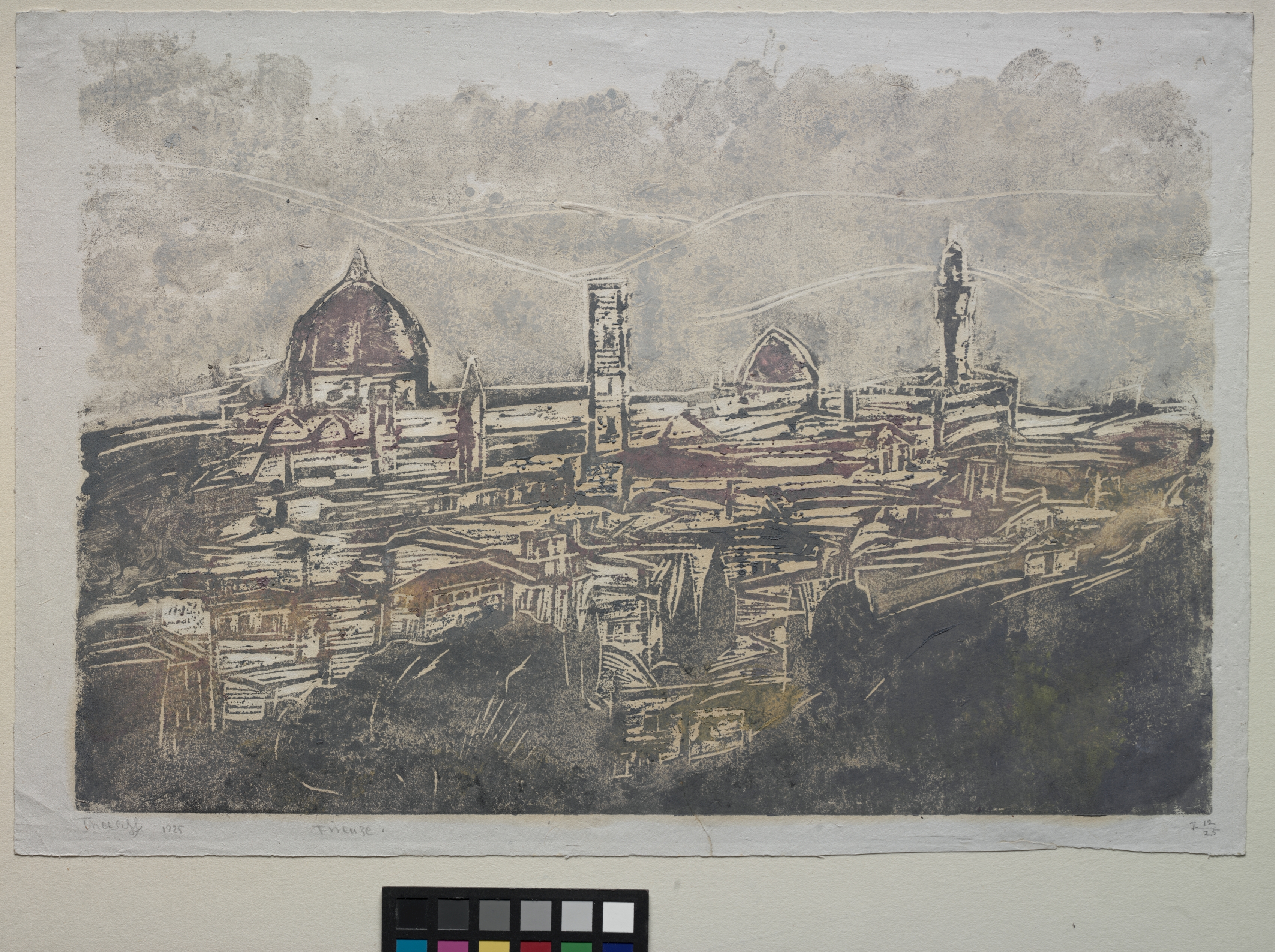 The image depicts View of Florence, Italy by Ellen Thesleff. The painting shows a cityscape with multiple buildings. The buildings are various heights and are colored shades of brown. The buildings appear to be clustered together with uneven rooftops. The bottom half of the image features dark green foliage. The background shows trees and a gray sky with visible white lines. The border around the image is off-white and rough. The image is colored in shades of brown, green and gray.