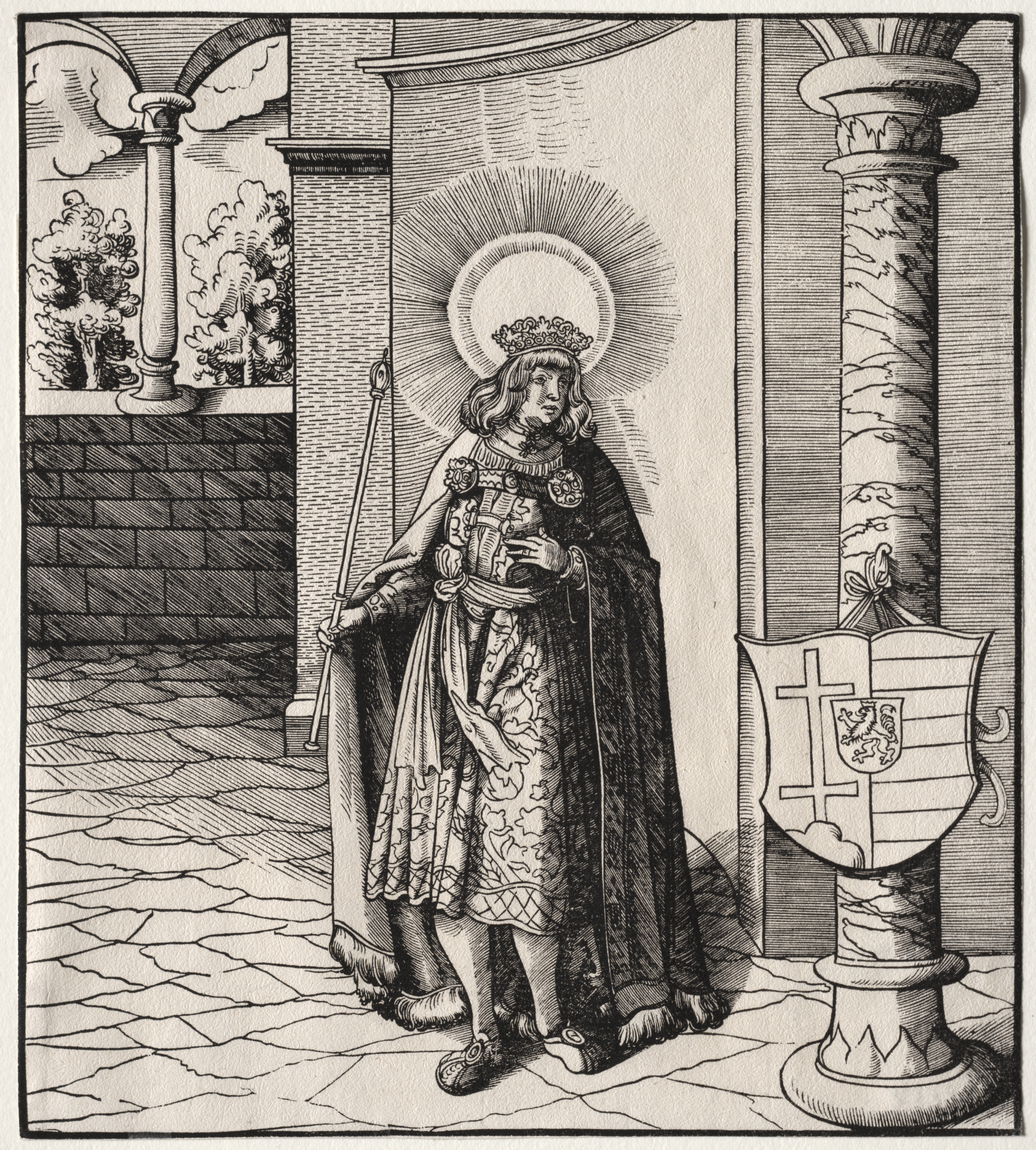 Black and white drawing of a man in a crown, cape, and formal clothing holding a spear. The man has long wavy hair, a halo around his head, and a jewel-encrusted crown. He wears a long robe with a patterned design and a dark cape. The man holds a long spear in his right hand and an object in his left. He stands on a stone floor next to a column. A shield with a cross and a coat of arms hangs on the column. Behind him are more columns and a wall with a window showing trees and a cloudy sky.