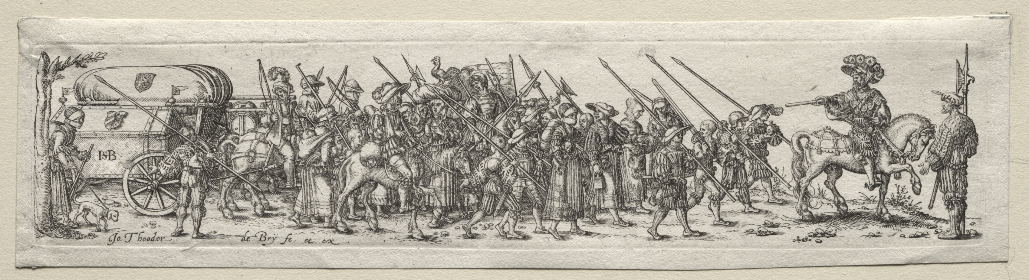 Black and white drawing on off-white background. Wagon with rounded roof on left. Wagon has shield emblem on roof and letters on side. Two horses side by side to right of wagon. Soldier standing beside horses. Group of soldiers with long spears, most on foot and one on horseback on right. Soldier on horseback gesturing to the right. Another man on right holding horse. Small tree on far left.