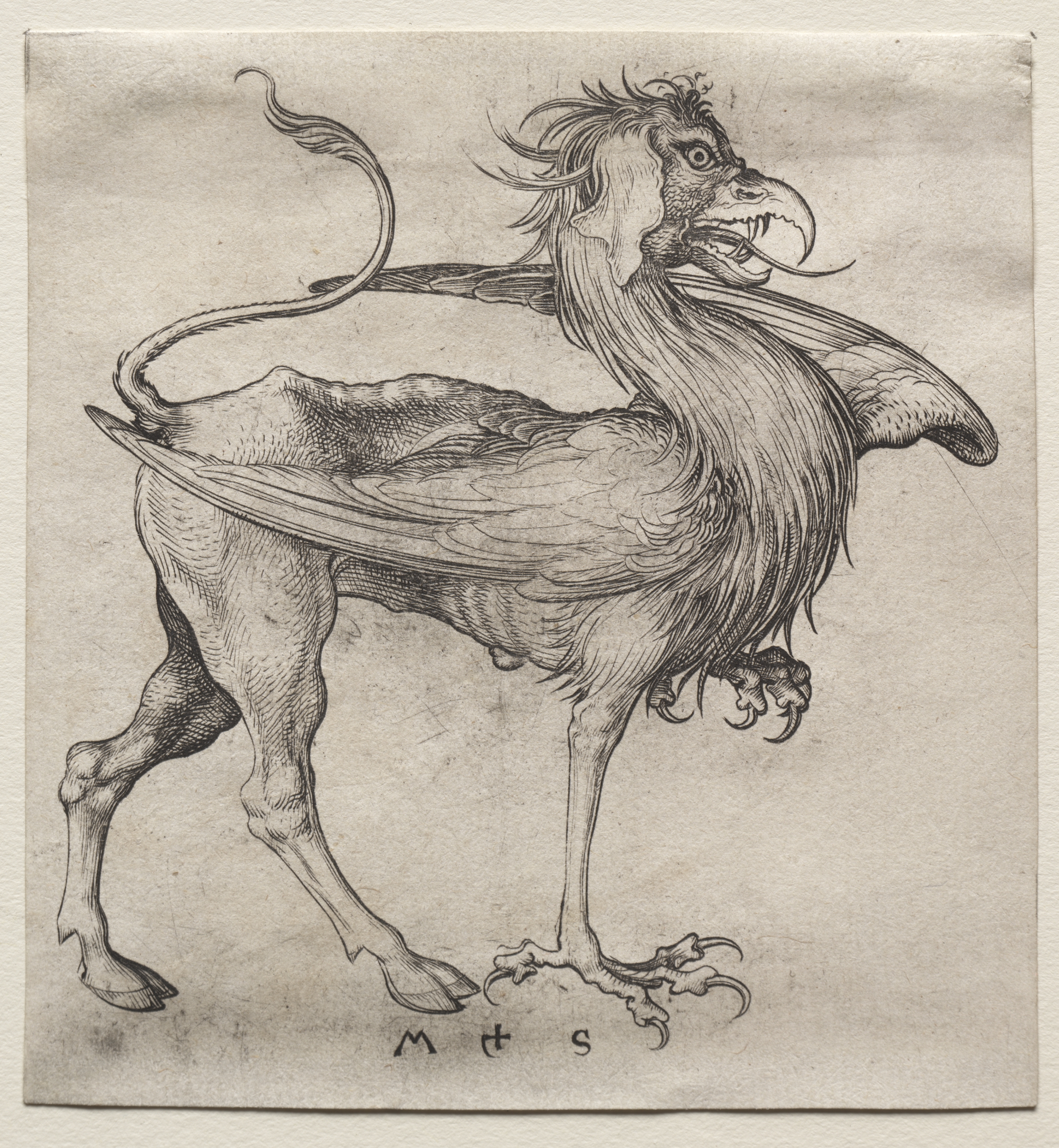 The Griffin by Martin Schongauer. A mythical creature with the body of a lion and the head and wings of an eagle. The creature is standing on all fours, with its body facing right and its head turned to the right. It has a large beak, sharp teeth, and long neck feathers. Its wings are spread out to the sides, with feathers visible on the wings and body. The creature has a long tail with a tuft at the end. Its front feet resemble bird feet with sharp claws, while its back feet resemble lion feet. The background is a light brown color with darker shading around the edges. The artist's initials "M+S" are written in small letters at the bottom center.