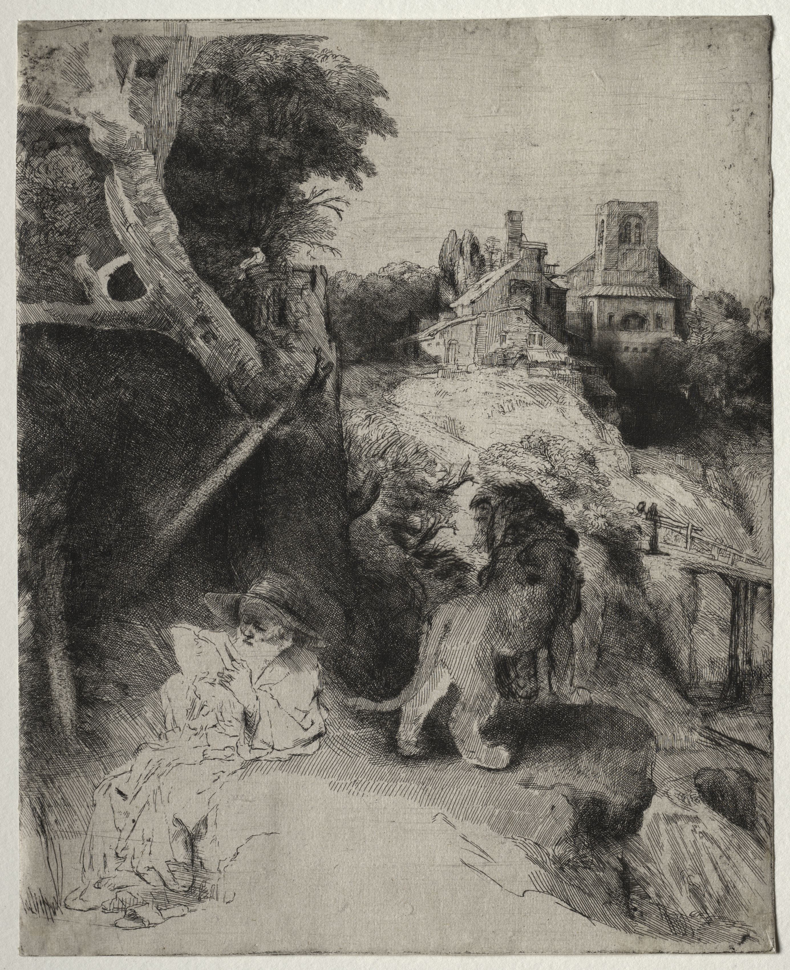 Black and white drawing of a man sitting on ground; man wears hat and long clothes, sits on left; reads book; lion next to man; tree on left; buildings on hill in background on right; road behind lion.