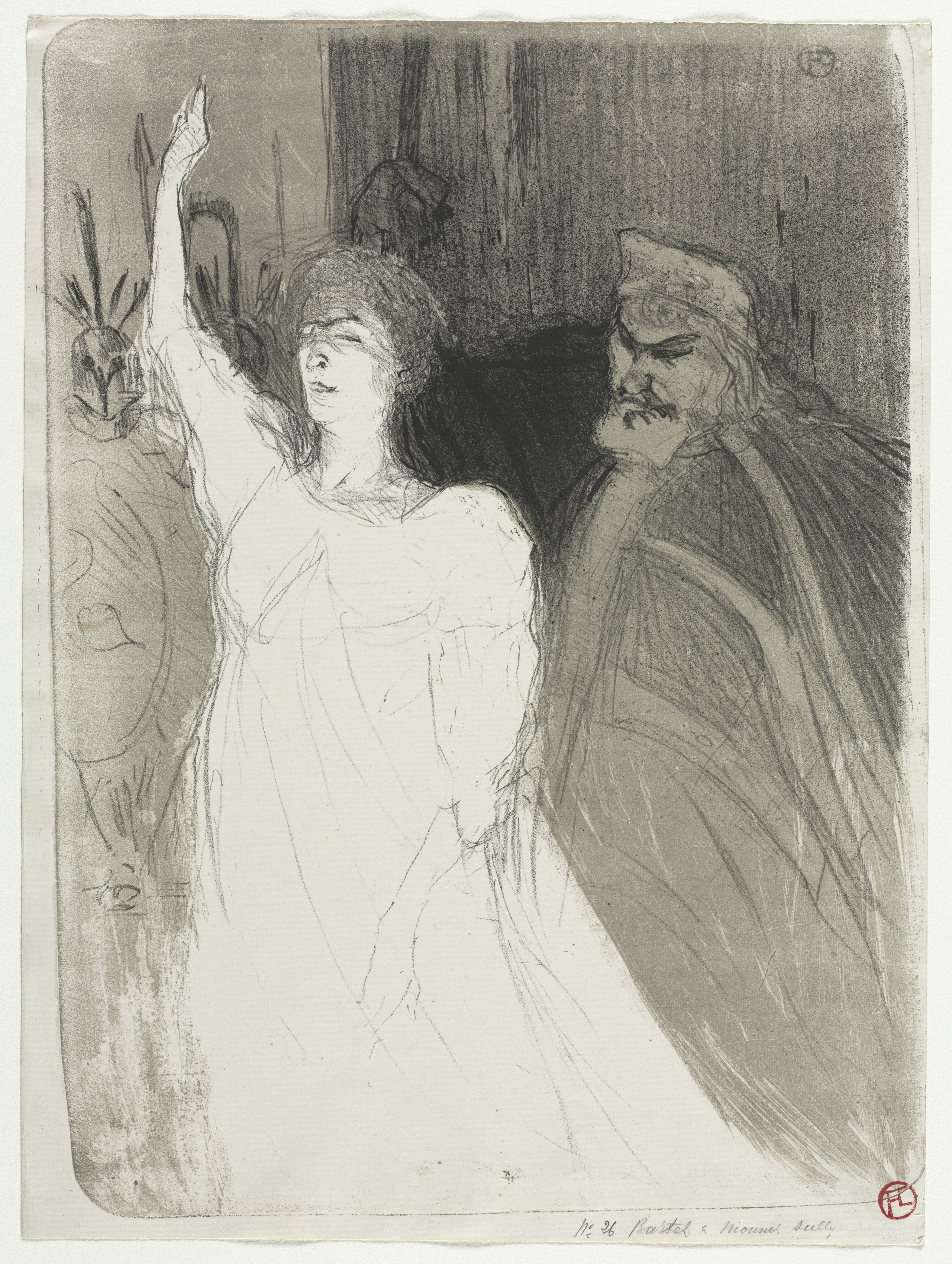 Black and white drawing of a woman with her right arm raised. She wears a white dress and a headband. A man in a dark cloak and hat stands behind her on the right. The background is a wall with a shield on the left. The woman and man are in front of a curtain. The drawing is signed and has a red seal in the bottom right corner. The overall style is somber and muted tones. The title is "A Princely Idyl" and the artist is Henri de Toulouse-Lautrec.