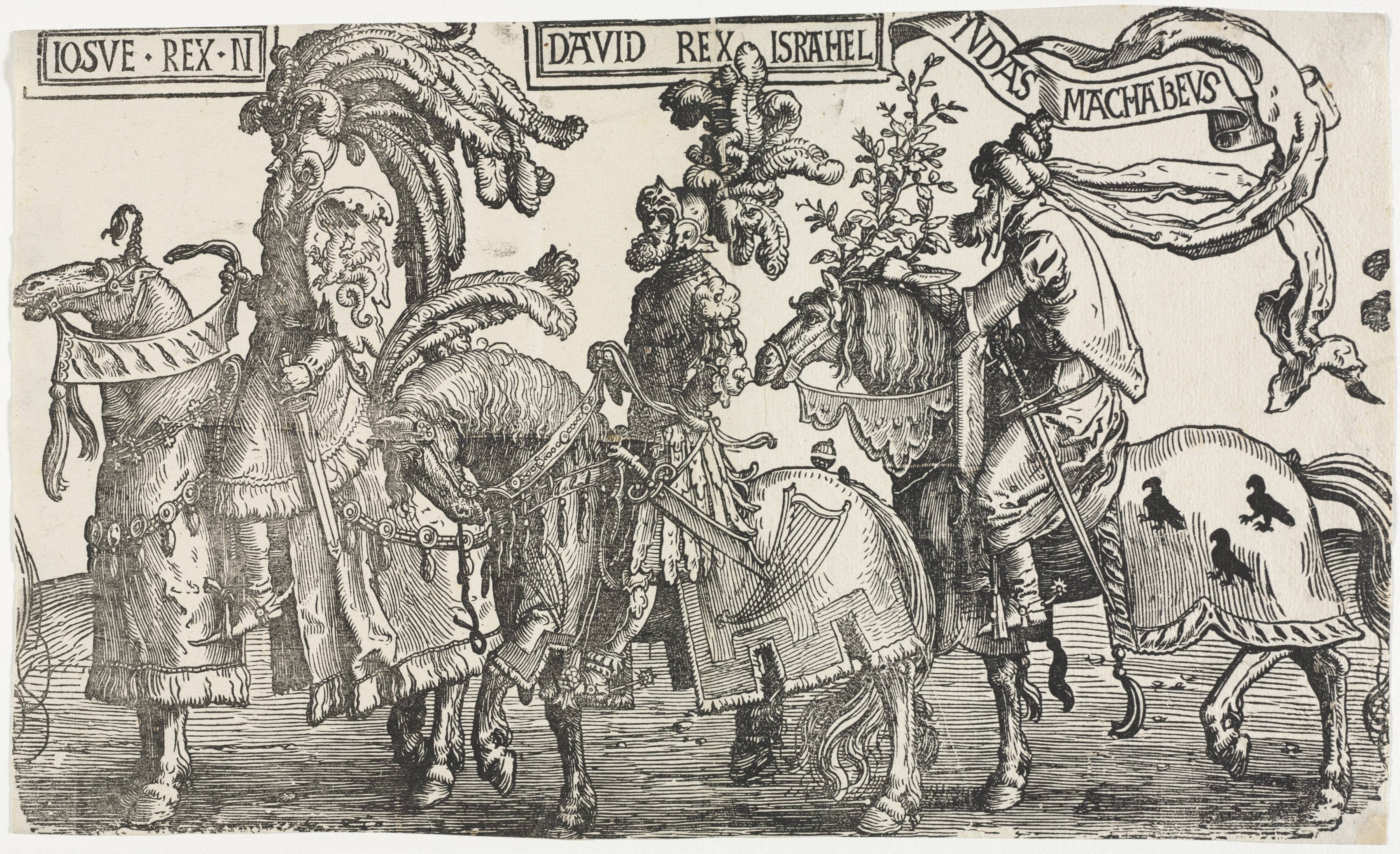 Black and white drawing of three men on horseback. The man on the left wears a helmet with a feather plume and a fur-trimmed cape. The horse has a fur-trimmed saddle blanket and a plume on its head. The man in the middle wears ornate armor with a helmet and carries a sword. The horse has a saddle blanket and a plume on its head. The man on the right wears a head covering and a cape with a sword. The horse has a saddle blanket with three birds on it. Each man has a nameplate above him: "IOSVE REX N", "DAVID REX ISRAHEL", and "INDAS MACHA BEVS". The background is a plain off-white color.