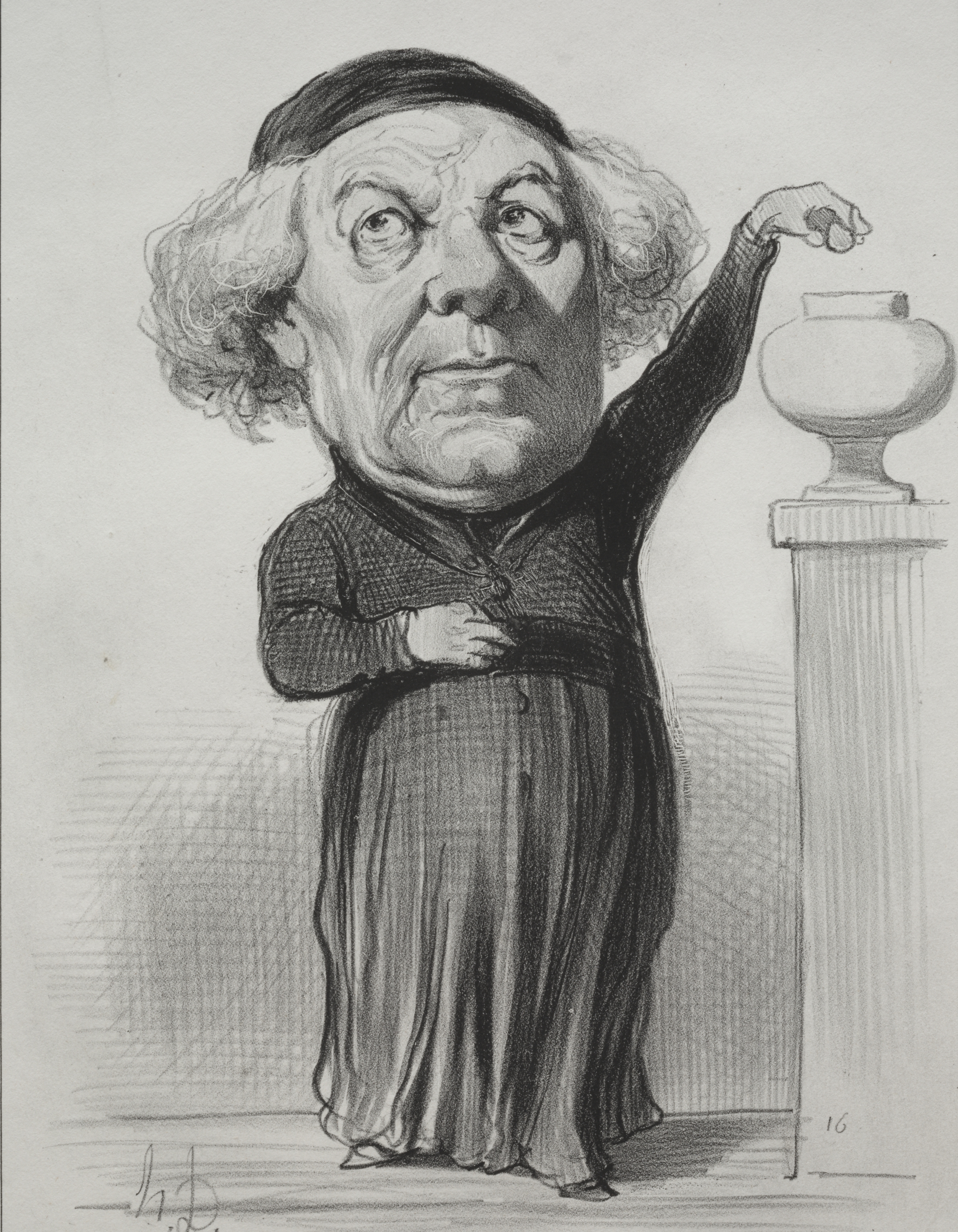 Black and white drawing of an older man with curly hair wearing a long religious robe and a skullcap. The man has a large head with deep facial wrinkles and his right arm raised. The hand of the raised arm is positioned next to and slightly behind a small urn atop a pillar on the right. The man's left arm is bent at the elbow with the hand positioned on his stomach. The background has simple shading on the left and a plain white space on the right. The artist's signature appears in the lower-left corner.