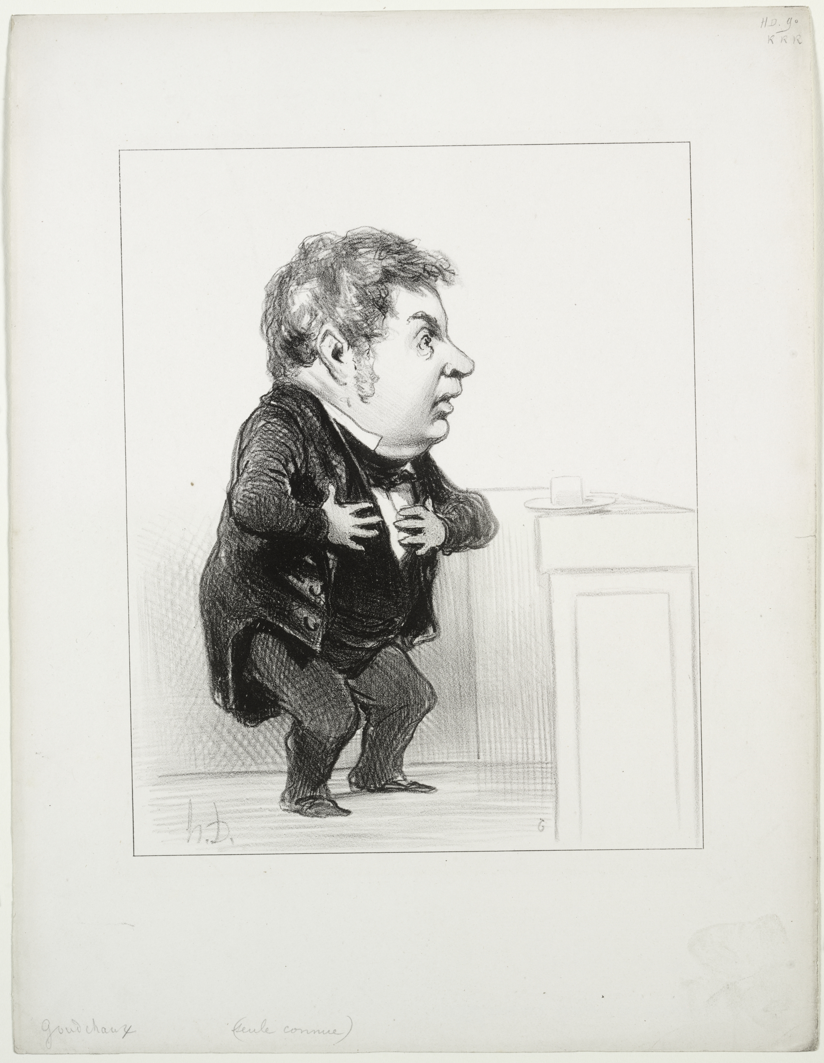 Black and white drawing of a man with a large head and torso, small legs, and short hair. He wears a dark suit jacket and pants. The man faces right, hands on chest, and stands beside a table with a cup and saucer on it. A thin black line borders the drawing. Handwritten text appears at bottom and top right.