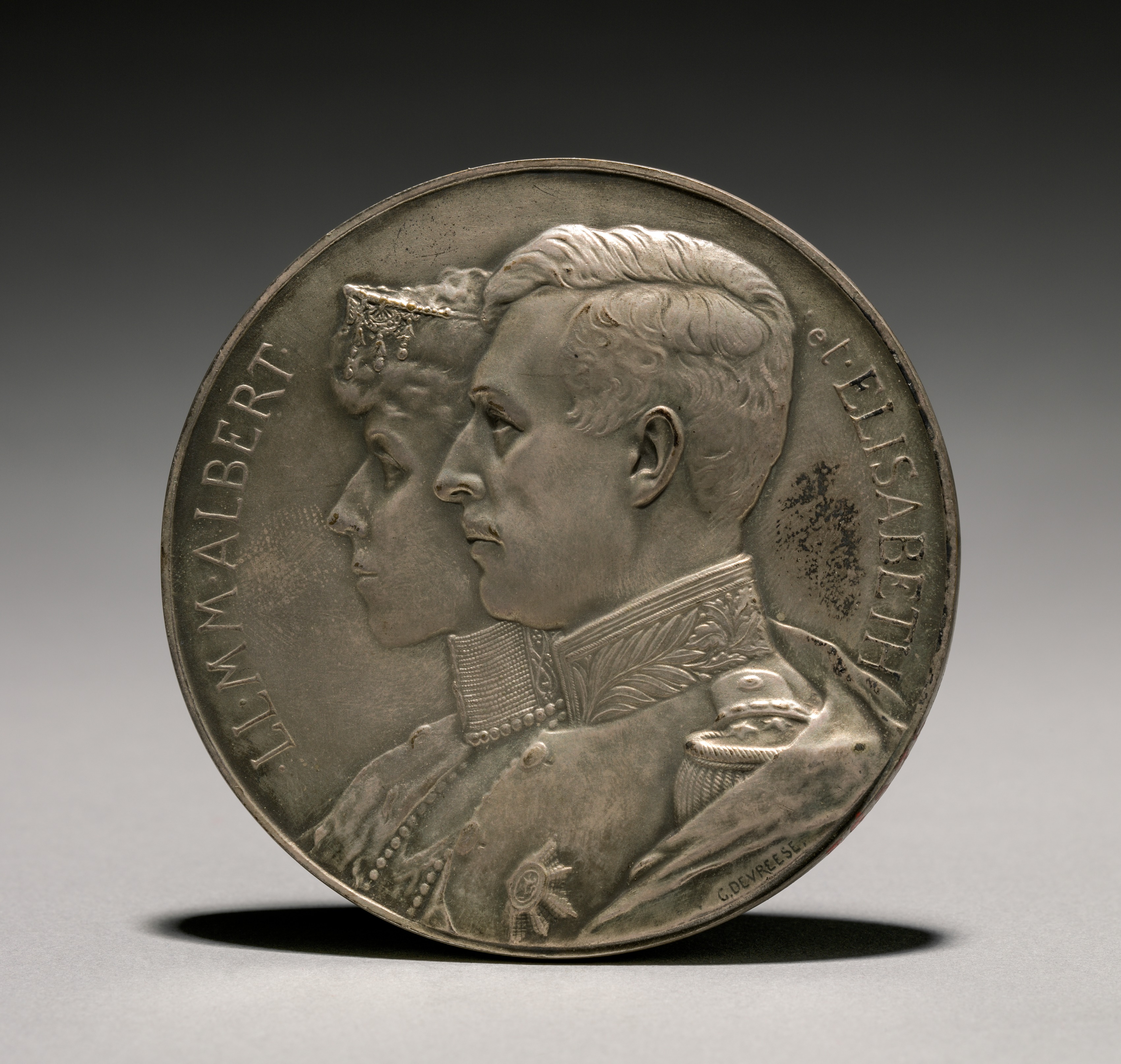 Medal with two profiles in relief facing left. The man on the right has short hair, and a military collar with epaulettes. The woman on the left has a crown on her head, and a beaded necklace. The man's name is not visible. The woman's name is written vertically on the left side of the medal: "ELISABETH". The man's name is written vertically on the right side of the medal: "LEOPOLD". However, this seems to be incorrect; it seems to say HM ALBERT on the left side. A small inscription is visible at the bottom, right side. The medal is circular and made of metal.