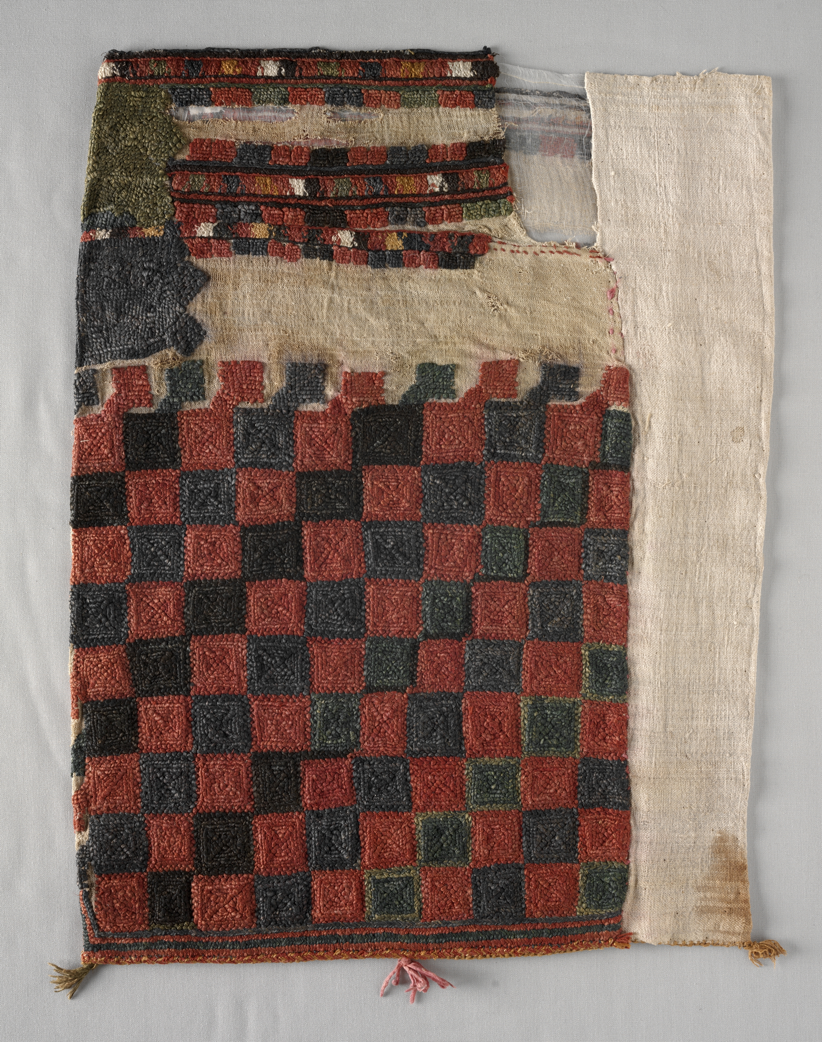 The image depicts a piece of fabric with a checkered pattern, titled "Skirt Border" by an unknown artist. The fabric is rectangular and appears to be a fragment of a larger textile. The bottom half features a grid pattern of alternating red and black squares. The top half is a lighter color with a few strips of fabric with multicolored stripes. The right side of the fabric is plain and off-white. The fabric has tassels at the bottom and appears to be frayed and worn, with some areas torn or missing. The background of the image is a light gray color.