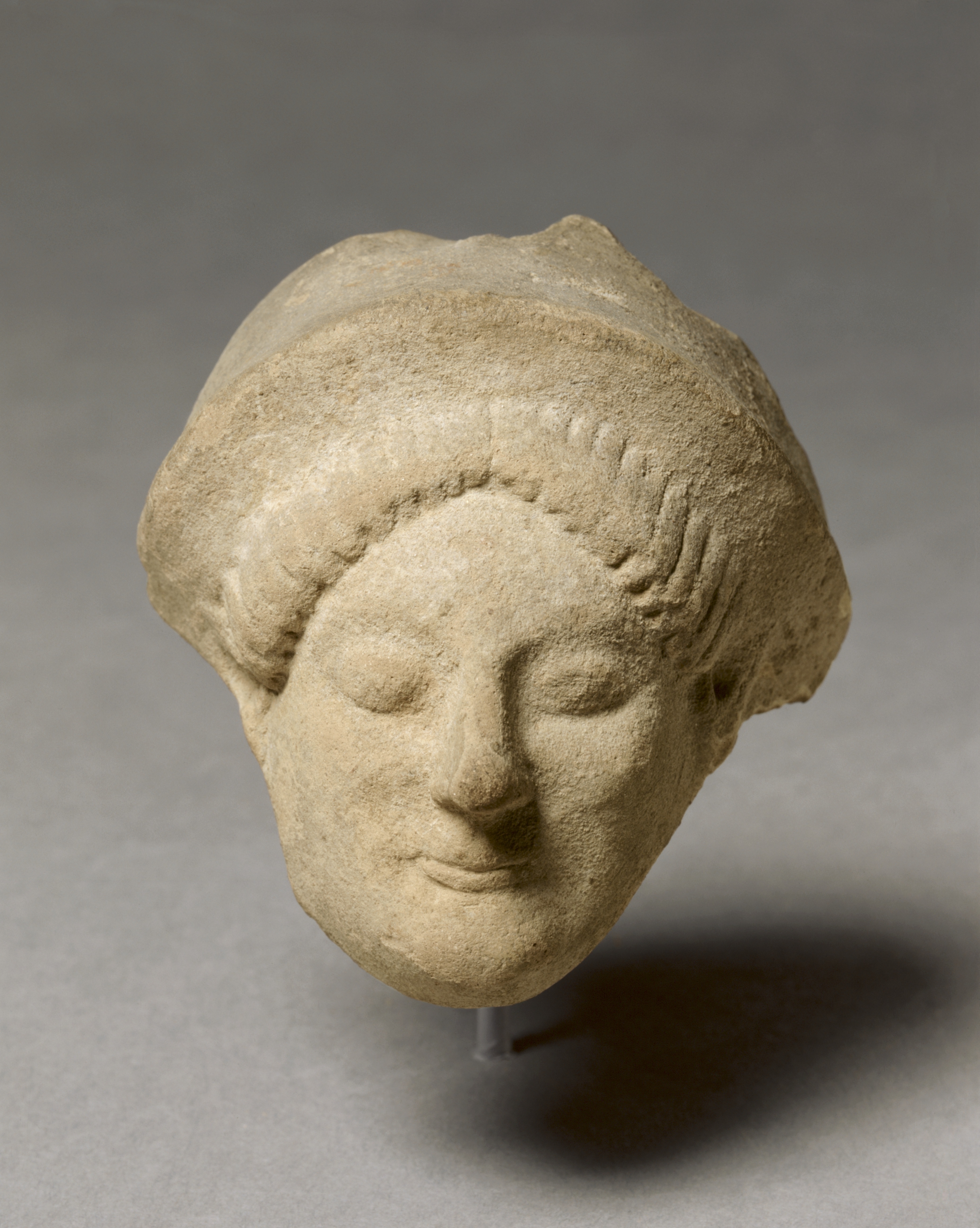 The Archaic Mask by an unknown artist depicts a stone sculpture of a human head. The head is tilted slightly to the right. The face has a neutral expression with eyes closed. The nose is straight and slightly pointed. The mouth has a small, straight line. The hair is carved close to the head with short lines etched into it. The sculpture is made of a light-colored stone and has a rough texture. A small metal stand supports the sculpture from below. The background is a plain gray color.