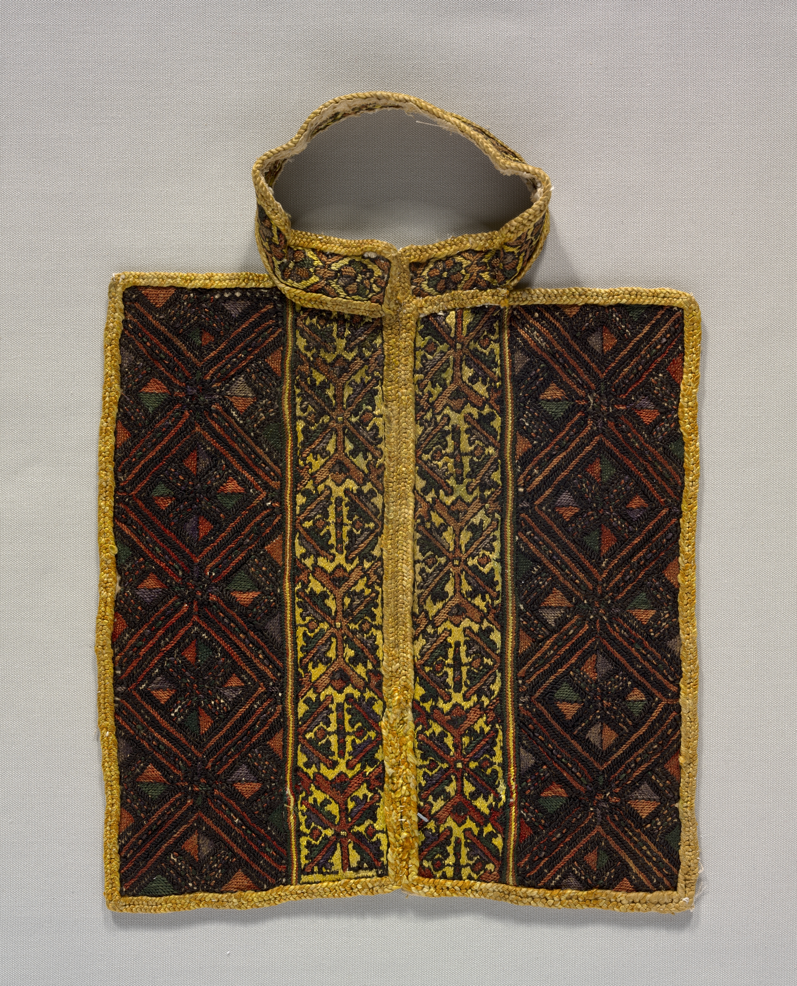 Blouse front with collar, by an unknown artist. The blouse front is square-shaped and has a high collar that folds down. The collar and edges of the blouse front are trimmed with yellow thread. The main body of the blouse front is primarily dark brown with a geometric pattern of triangles and lines in shades of orange, green, and yellow. There are three vertical sections down the center of the blouse front, with the middle section having a yellow background and a darker pattern. The background behind the blouse front is light gray.