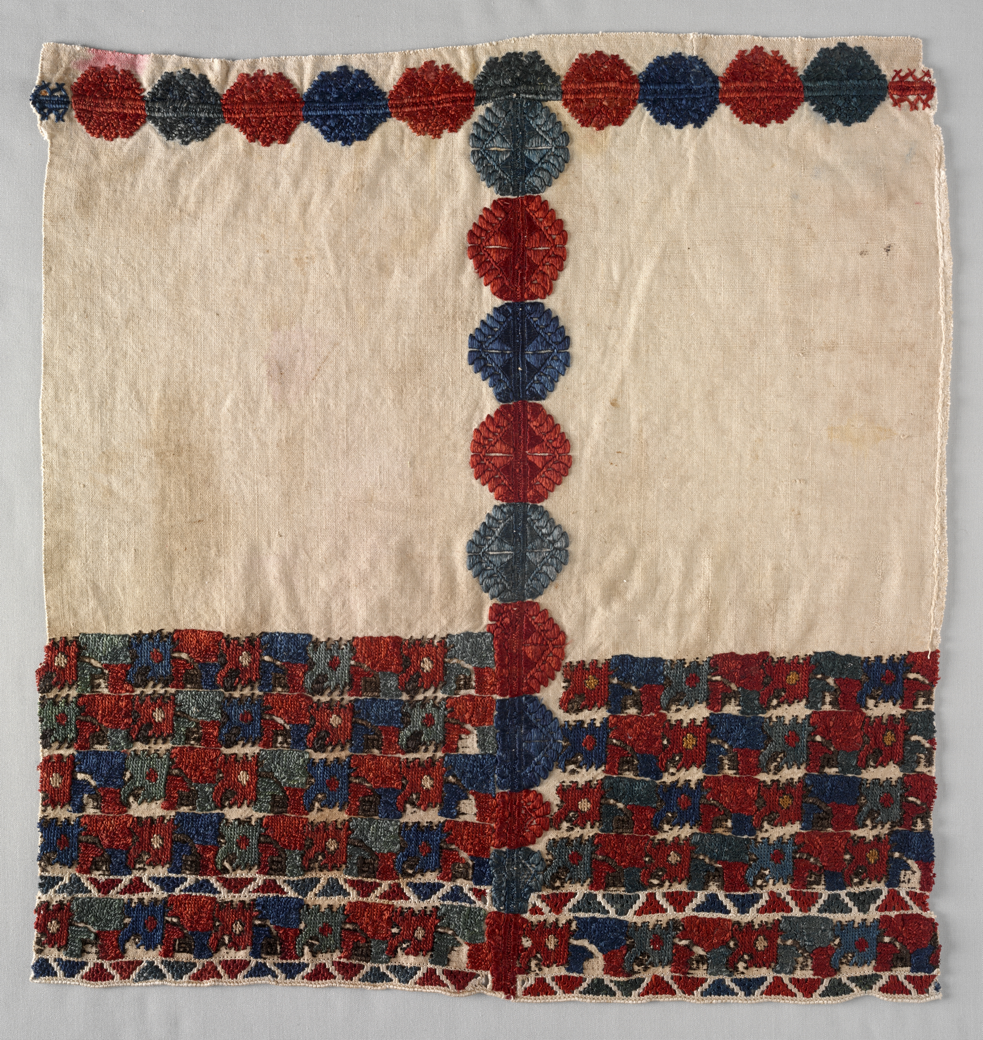 The image shows a square piece of fabric with a white background and colorful designs on it. The top edge has a row of 13 circles in red, blue, and gray. Below the row of circles, there is a vertical line of 6 circles in red, blue, and gray. The bottom edge has a wide border with a geometric pattern in red, blue, and gray. The fabric appears to be made of a rough, textured material, possibly cotton or linen. The background behind the fabric is light gray. The fabric is titled "Sleeve" and is by an unknown artist.