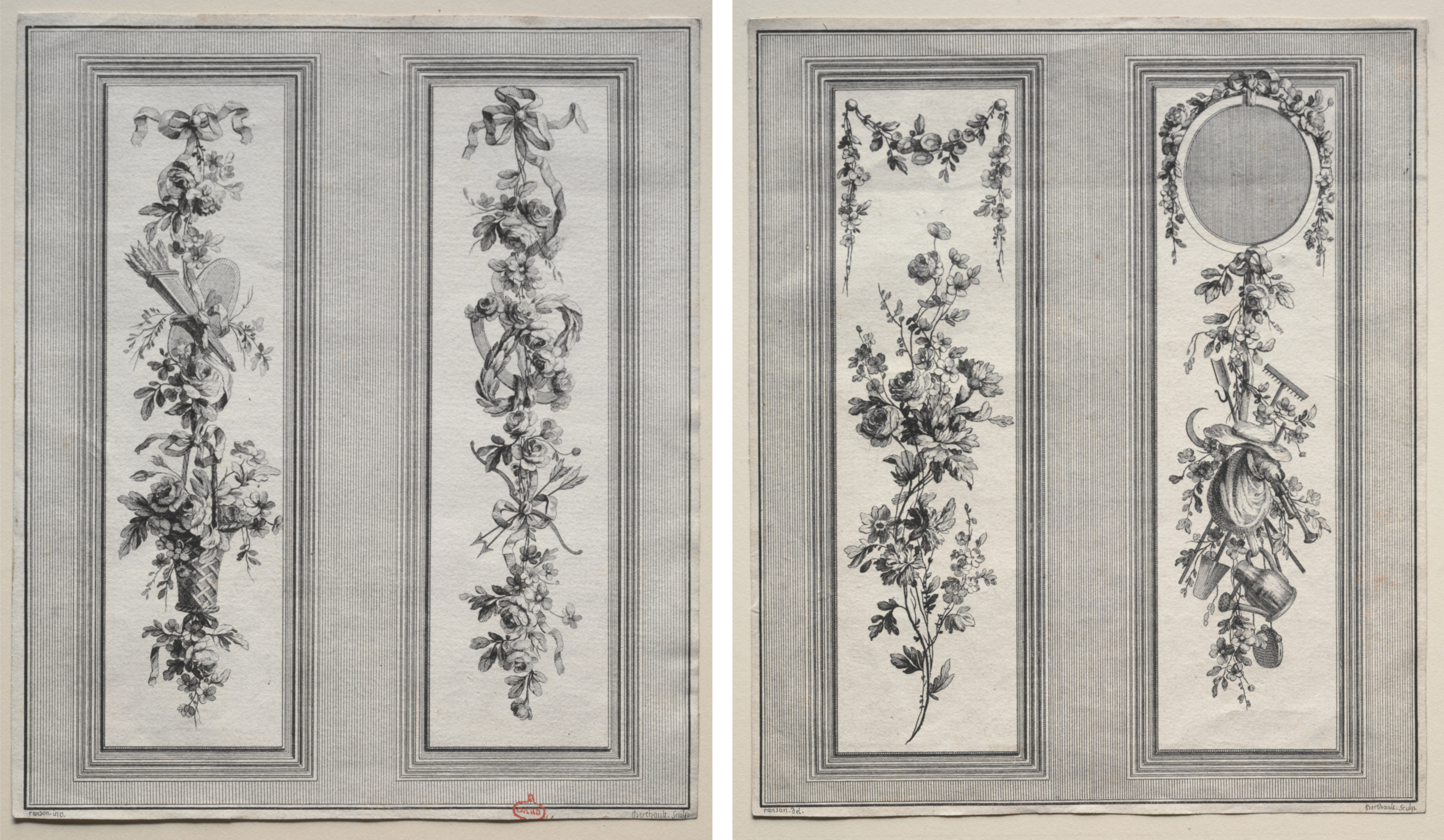 Black and white illustration of four vertical panels with floral and leafy designs. Two panels are on the left side and two on the right side. The leftmost panel contains a bouquet wrapped with a ribbon. The second panel from the left contains a cherub surrounded by flowers. The third panel from the left contains a stem of flowers. The rightmost panel contains an empty circle surrounded by a floral design at the top and musical instruments hanging from a floral design at the bottom. All panels have a gray border around them. The artwork is by Pierre Gabriel Berthault and is titled "Garden Ornament".