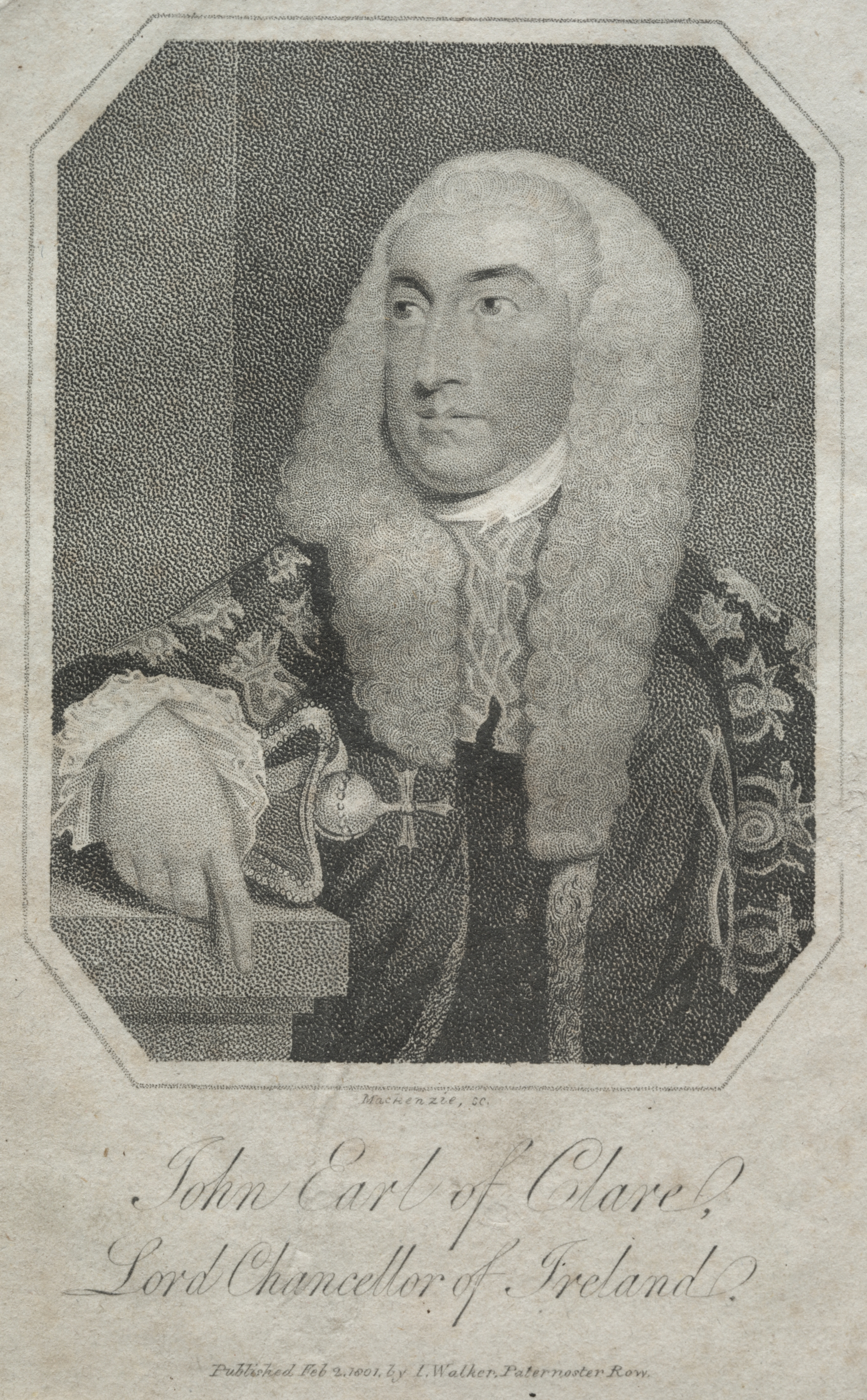 Black and white portrait of a man with long, curly hair. He wears a dark robe with floral designs on the sleeves and a white lace shirt with a high collar. A belt with a cross-shaped buckle is around his waist. His right arm rests on a surface, with his hand hanging over the edge. The portrait is in an octagonal frame. The background is darker on the left and lighter on the right. Underneath the portrait, there is a title in cursive writing.