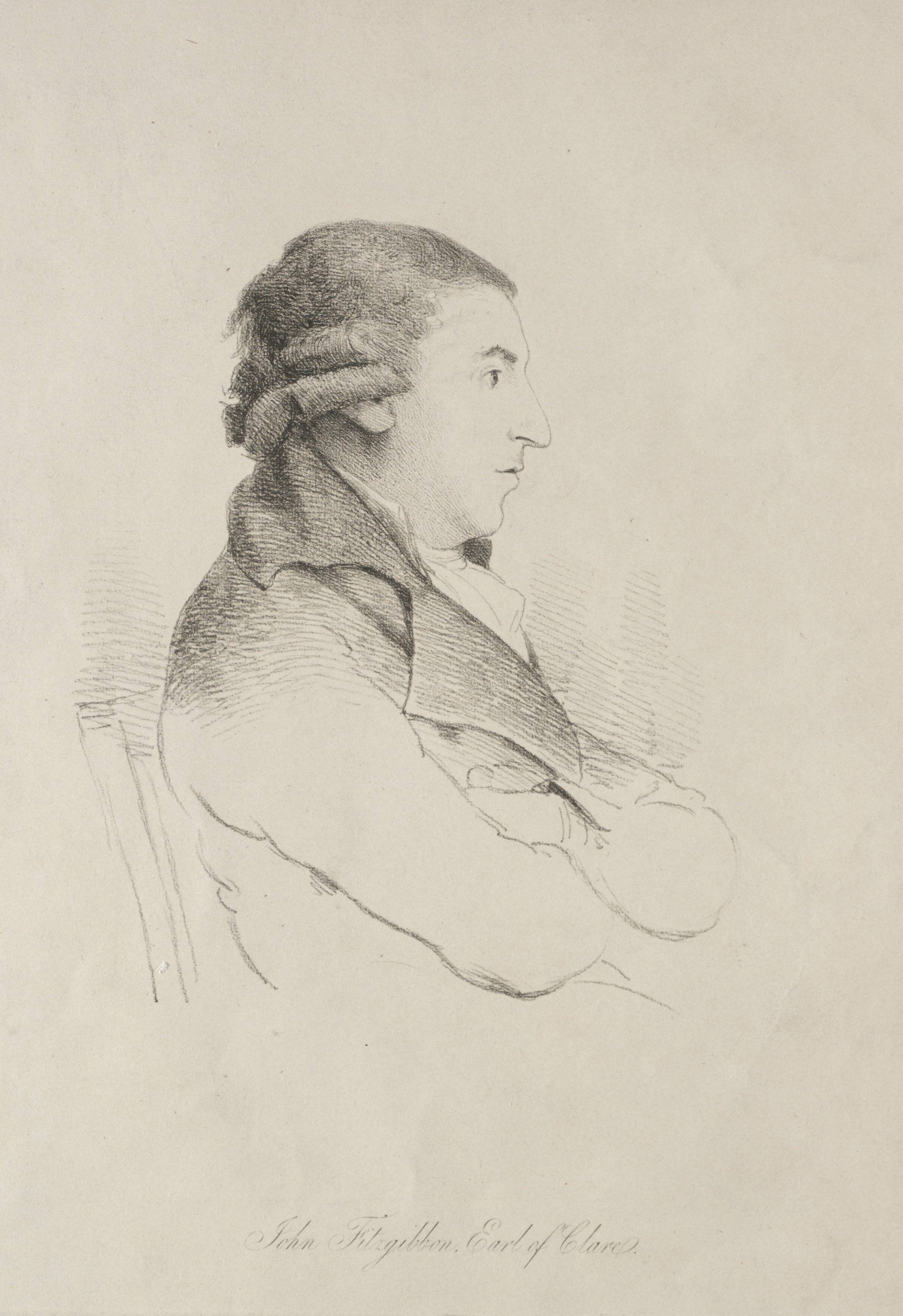 The drawing depicts a man with fair skin and short, dark hair combed back and secured with a ribbon, viewed from the side. He wears a light-colored shirt with a high collar, covered by a darker-colored jacket or vest. The man sits on a chair with his arms crossed. His facial features include a straight nose, thin lips, and prominent jowls. The text at the bottom of the image reads 'John Fitzgibbon, Earl of Clare'. The background is a plain, light-colored surface.
