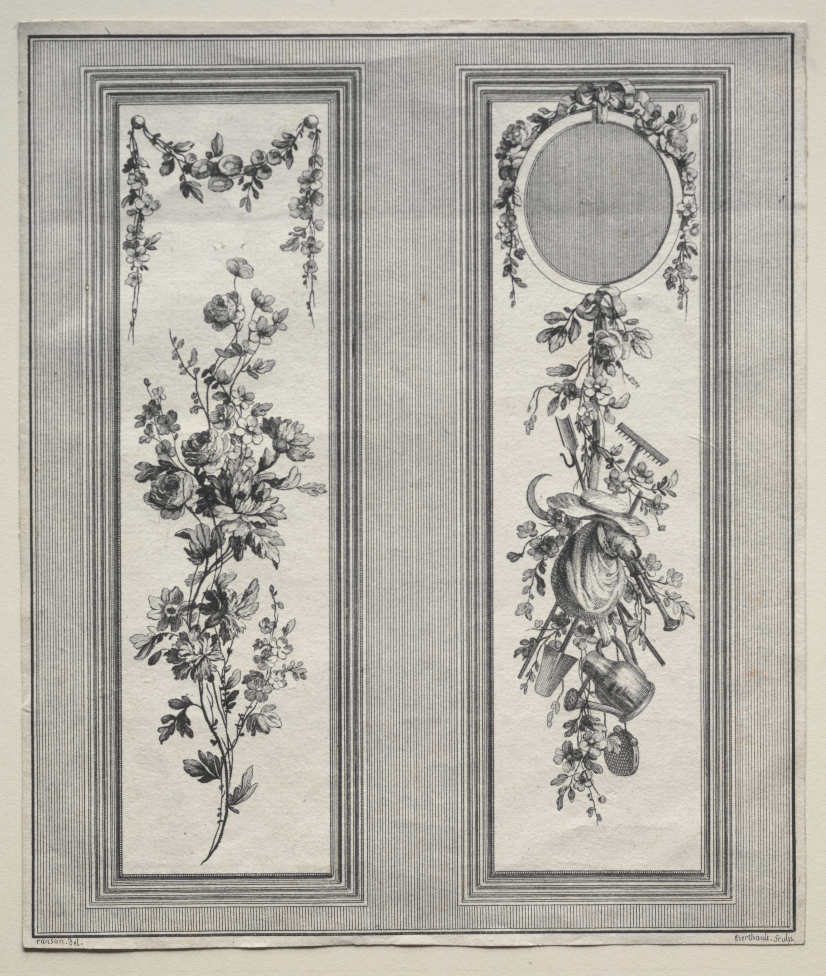 Garden Ornament by Pierre Gabriel Berthault. Black and white drawing on a beige background. Two long, narrow, vertical panels side by side. The left panel has a border of short leaves and berries at the top and a long curved stem with flowers. The right panel has a circular area at the top right, surrounded by a border of leaves and flowers. The bottom half of the right panel has a collection of gardening tools hanging from a garland of flowers and leaves. The tools include a rake, watering can, basket, and other items, arranged vertically. The entire image is surrounded by a series of rectangular borders with varying line patterns.