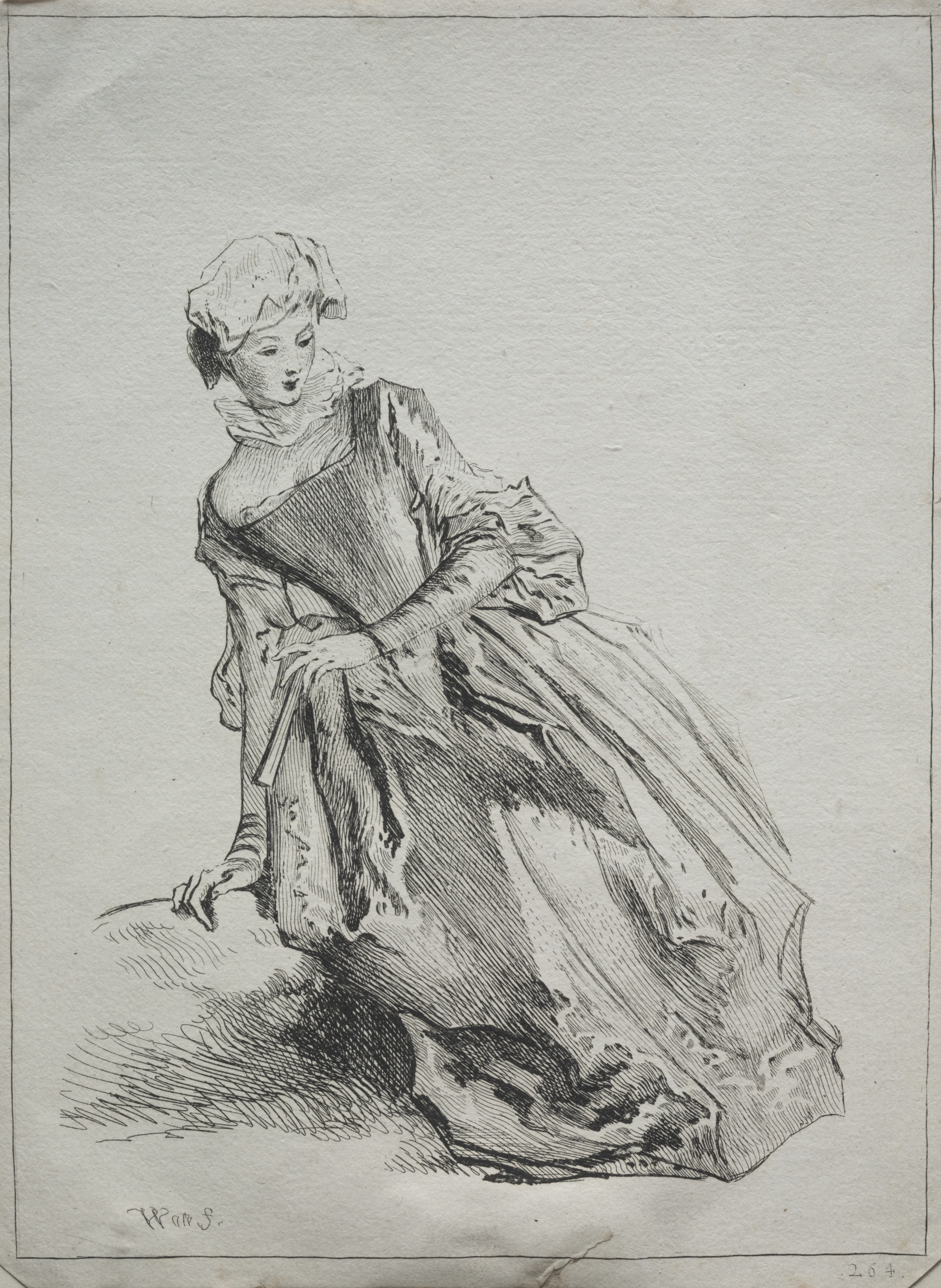 Black and white drawing of a woman wearing a dress and a head covering, seated and leaning forward slightly, on a gray background. The woman has short hair. She wears a long dress with puffy sleeves and a scarf around her neck. Her right hand rests on her knee, and her left hand is on the ground. The drawing is signed in the bottom-left corner. A number is written in the bottom-right corner. The drawing is framed by a thin line. The overall style is detailed and realistic. The artist is Jean-Antoine Watteau. The title is Woman Seated.