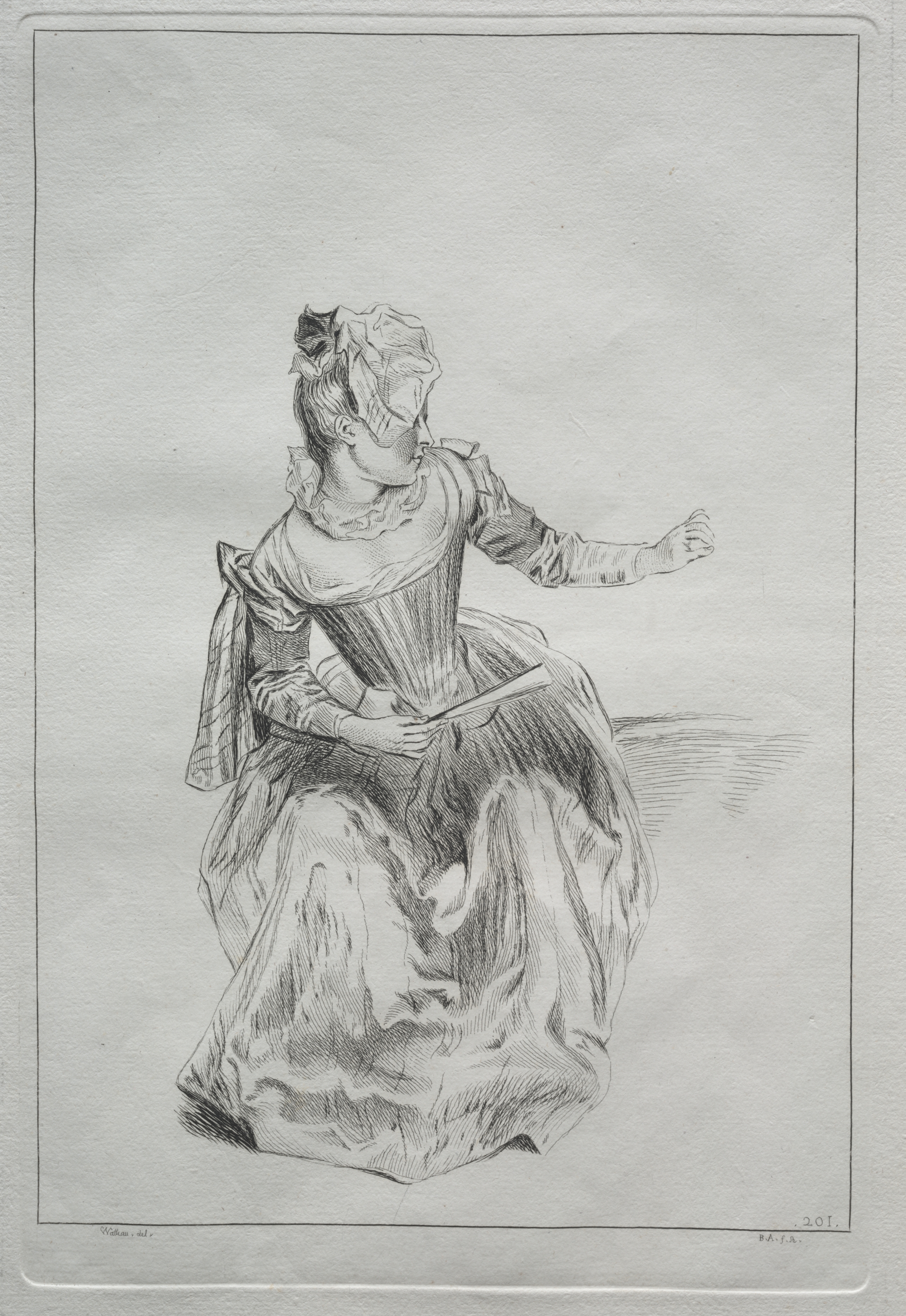 Black and white drawing of a woman sitting while holding a fan. The woman is wearing a long dress with a corset and a decorative headpiece. Her right arm is bent at the elbow and her left arm is extended outward. She is sitting with her body facing the right. The background is plain and light-colored. The drawing is surrounded by a thin border.
