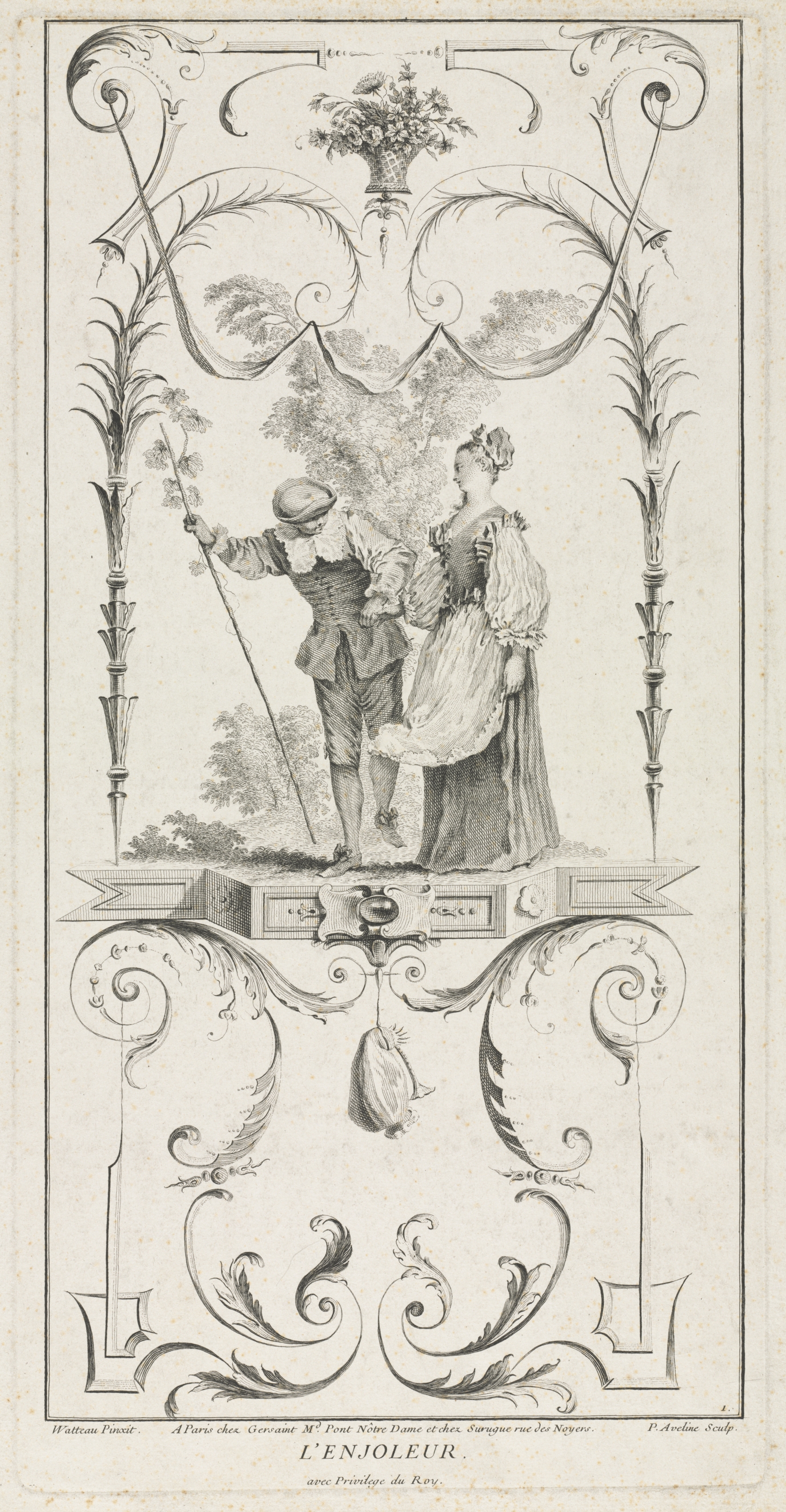 Black and white illustration of a man and a woman standing on a box; man holds long stick in right hand. Woman wears a dress and a hairstyle with a bow; man wears a cap, short pants and a shirt with billowy sleeves. A vase with flowers sits atop an S-shaped frame surrounding the pair. The frame has a thin border and ornate bottom section with text. Text at bottom centre reads "L'ENJOLEUR".