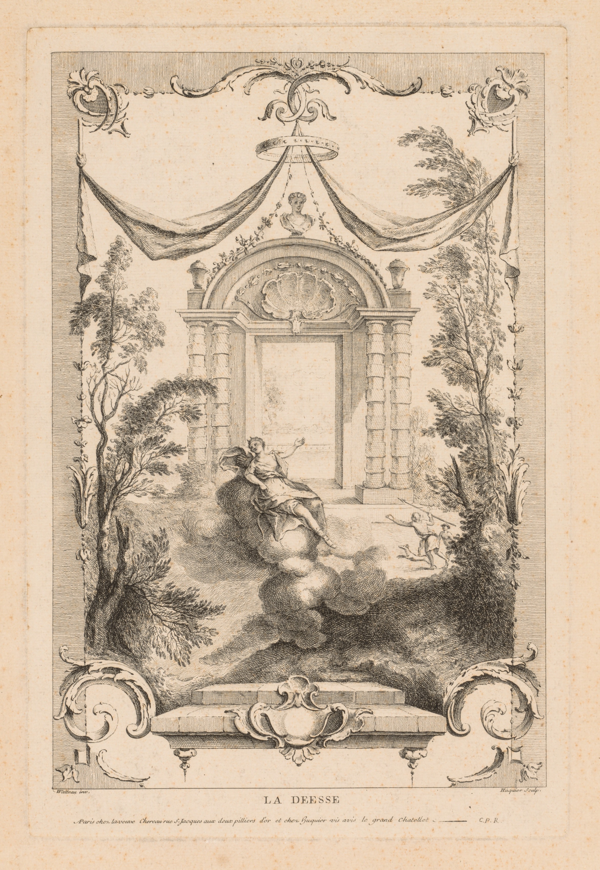 A black and white illustration on aged paper depicts Diana, the Roman goddess of the hunt, sitting on a cloud. The goddess has short hair and wears a short dress; she holds a bow in her left hand and an arrow in her right. Below her, a man wearing only a loincloth and holding a bow runs through clouds on the bottom right. The scene features trees on either side and a large stone doorway with columns behind them. The doorway is adorned with a carved arch and a draped fabric above it. The illustration is framed by a decorative border with scrollwork at the top and bottom. The bottom of the illustration includes the text "LA DEESSE".