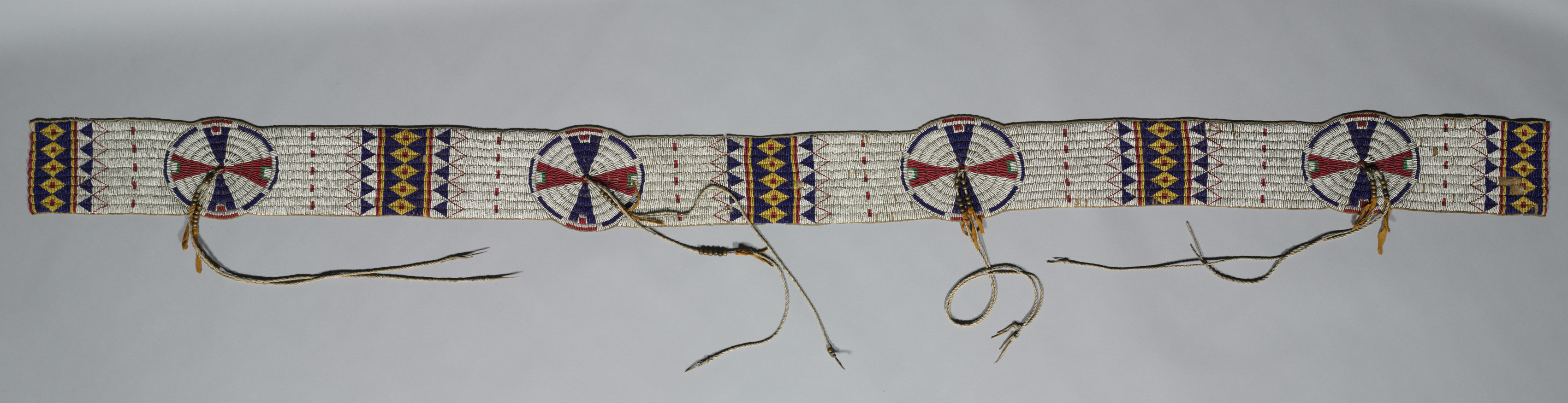 White beaded belt with circular designs. The circular designs have red, blue, and white colors and are separated by rectangular patterns. There are yellow, blue, and red geometric patterns. Long threads are hanging from the belt. The belt is titled "Blanket Strip" by an unknown artist.