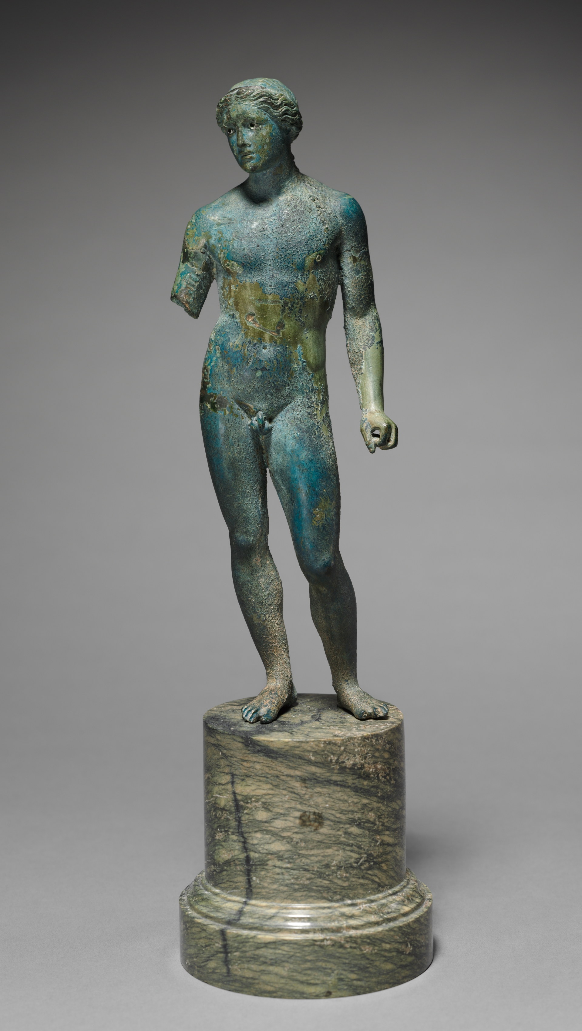 The image shows a bronze statue titled "Athlete or Apollo", by artist Phidias. The statue depicts a male figure with a muscular build, depicted without clothing. The figure's right arm is missing, while the left arm hangs at the side. Head is tilted slightly to the right. The figure's hair is short and curly. The statue exhibits a green patina and stands on a cylindrical base made of green marble with darker green veins. The base has a flat top and a rounded bottom. The background gradient transitions from dark gray at the top to light gray at the bottom.