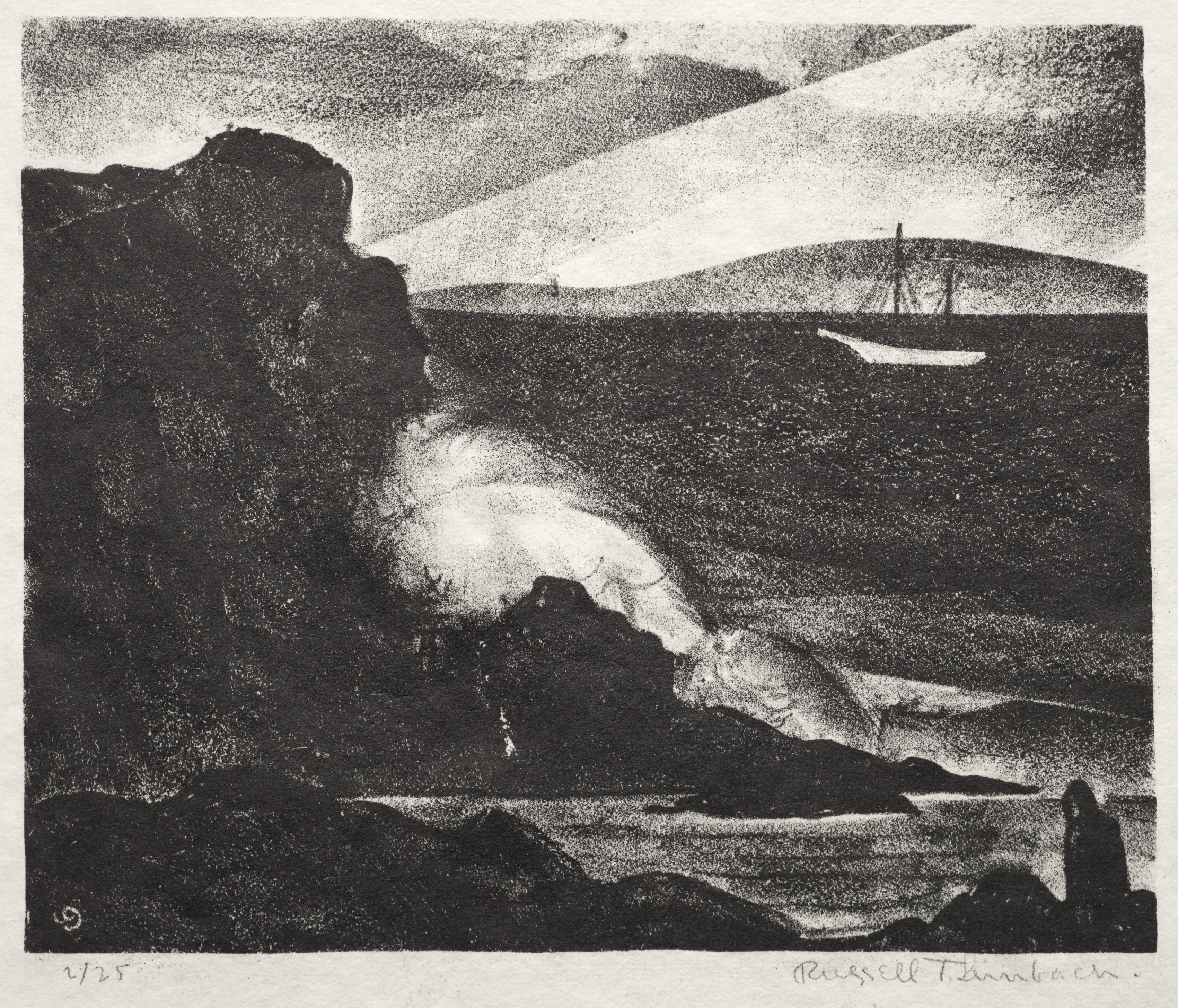 Black and white landscape drawing. Large cliff on left side. A stream descends from the cliff. Ocean to the right. A boat on the water. Hills in the background. A figure on the bottom right. Stippling style drawing. The Wave by Russell T. Limbach.