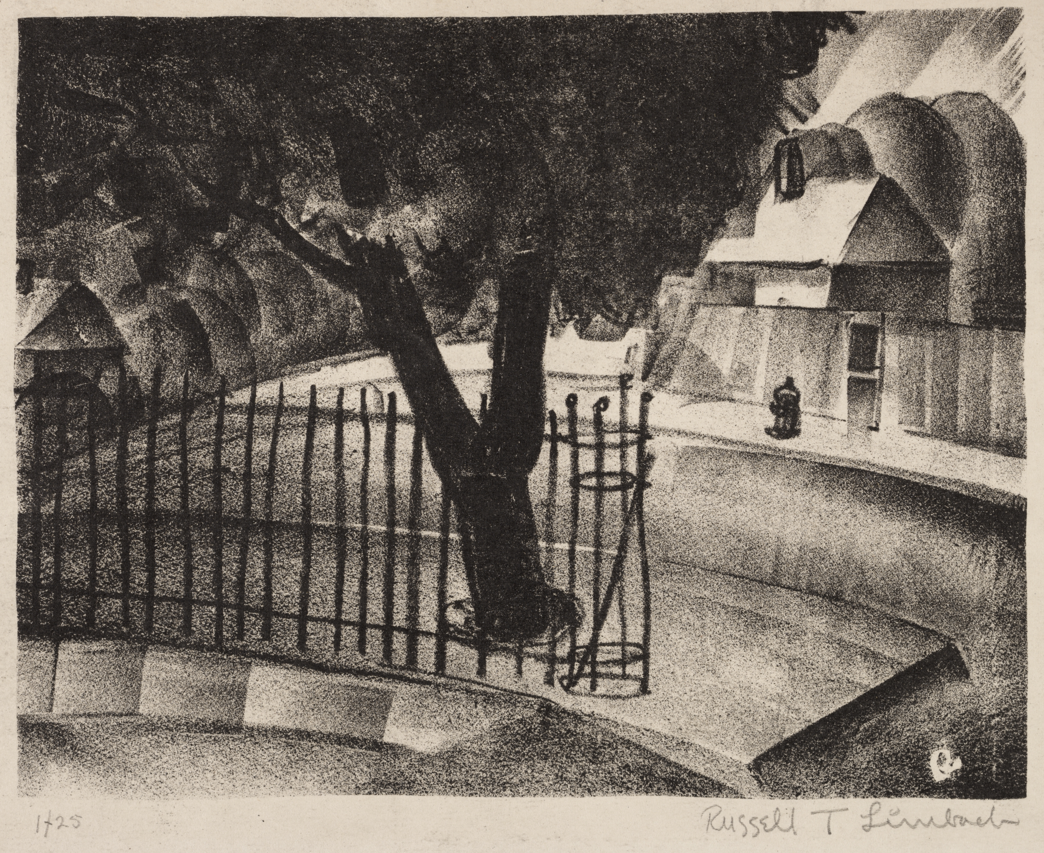 Black and white drawing of a tree behind a metal fence. A house is to the right. The artist's name is written at the bottom.