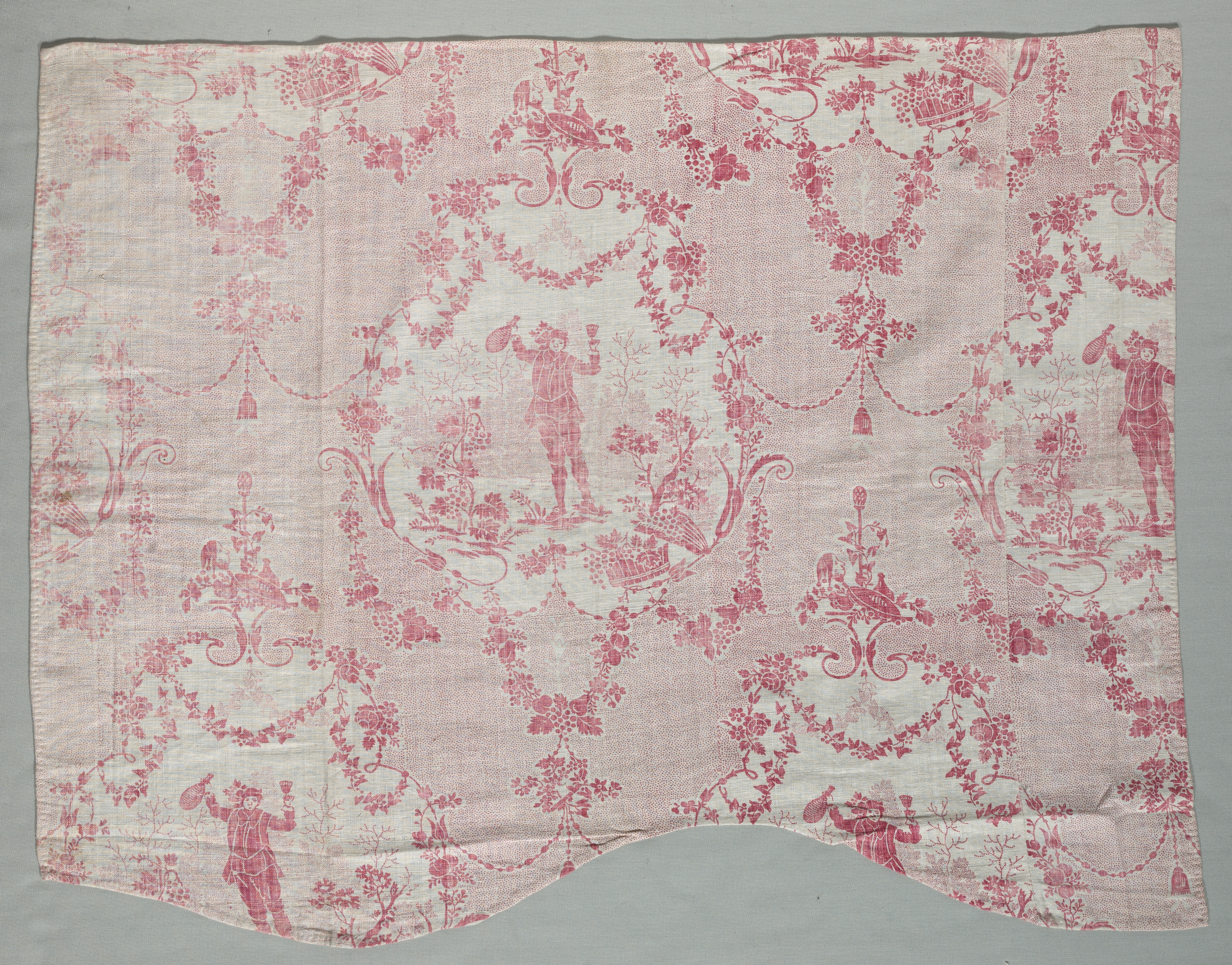 The image shows a rectangular piece of fabric with a pink and white toile pattern. The fabric is primarily white with a repeating design in pink. The design features various scenes, including people, flowers, trees, birds, and other foliage. The scenes are arranged in medallion-like shapes with floral wreaths and garlands surrounding them. The fabric appears to be made of cotton or a similar material and has a slightly wrinkled appearance. The edges of the fabric are rough and uneven, suggesting that it may have been cut or torn. The background behind the fabric is a solid gray color. The fabric's pattern and color scheme are consistent with traditional toile de Jouy designs. The overall style of the fabric is reminiscent of 18th-century European textiles.