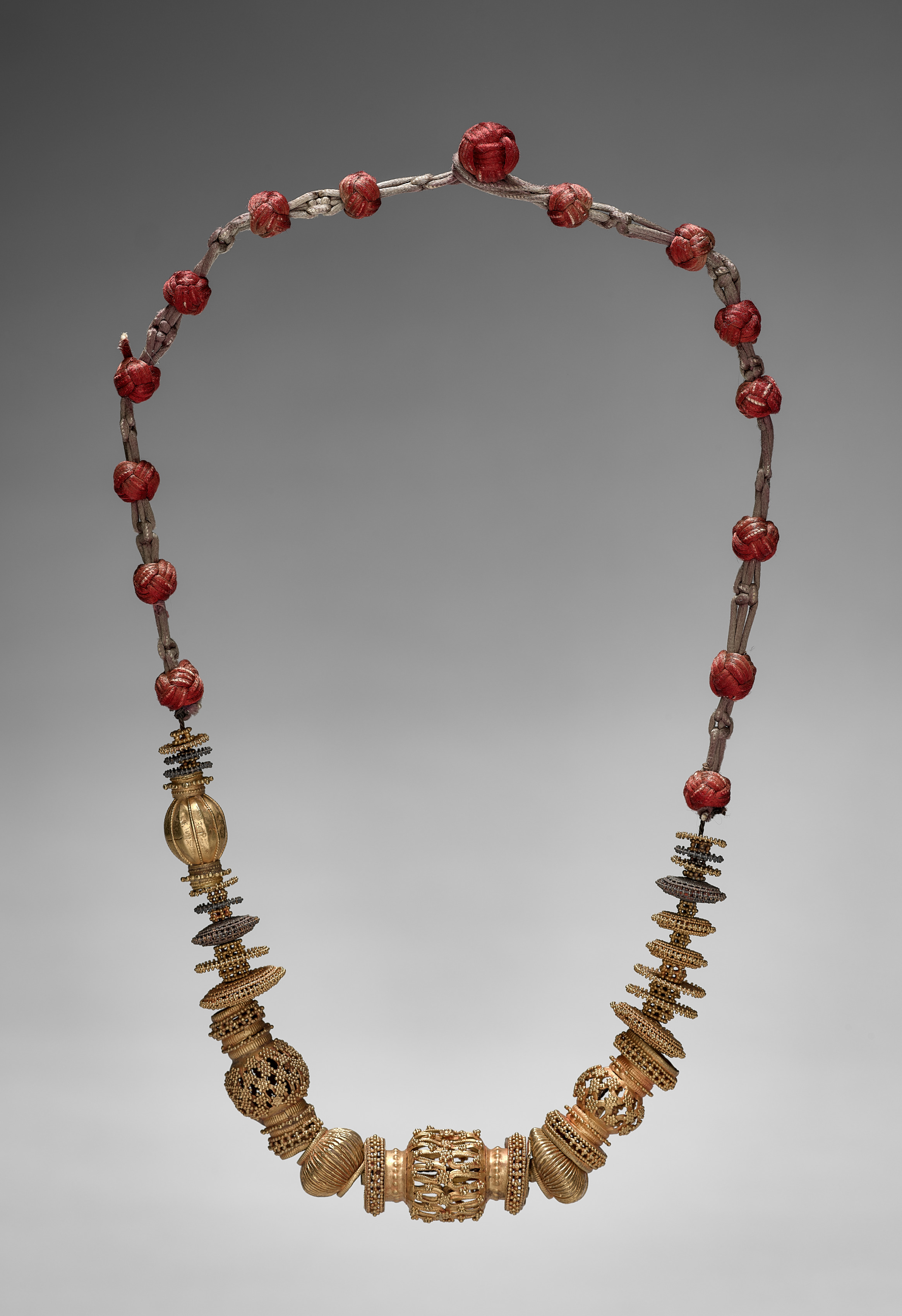 Necklace by Kenneth Jay Lane. A gold-colored necklace with a central focal point consisting of a large, intricately designed cylindrical component. Two graduated clusters of gold-colored metal pieces extend on either side of the center, featuring a variety of shapes such as disks, cylinders, and spheres. These pieces decrease in size as they move towards the ends. The necklace has a cord made of brown material, possibly leather or fabric, strung with approximately 19 red spherical beads, each with a textured surface and a metallic sheen, spaced evenly throughout. The background is gray, transitioning from dark at the top to light at the bottom.
