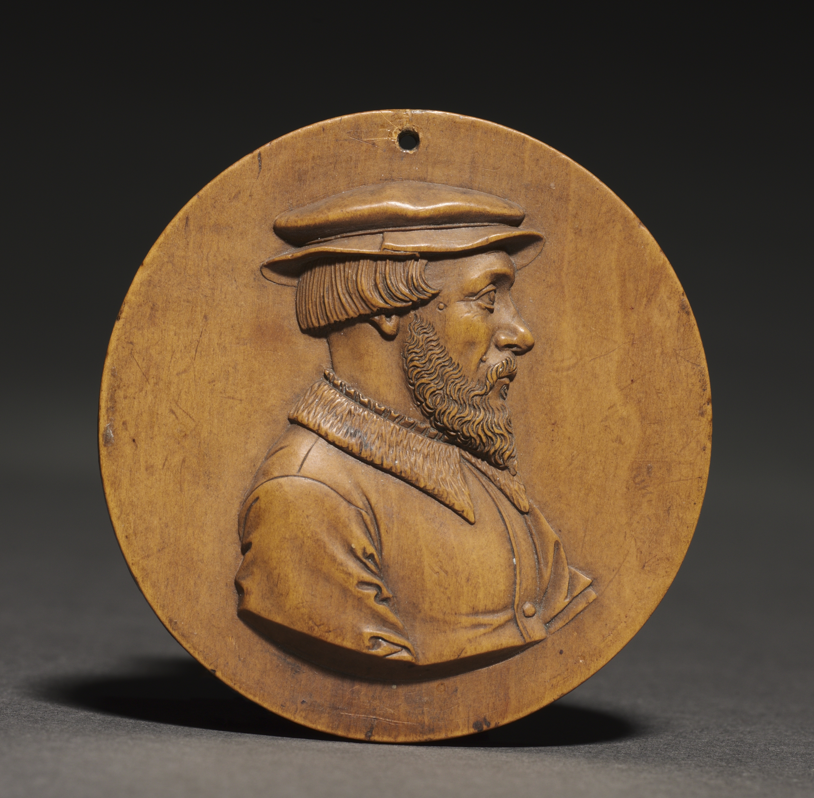 Portrait of a Man by Christoph Weiditz. A circular wooden plaque with a relief carving of a man's head and shoulders. The man has a beard and mustache. He wears a hat with a flat top and a high collar. A small hole is at the top of the plaque. The background is dark gray. The plaque casts a shadow on the surface below it.