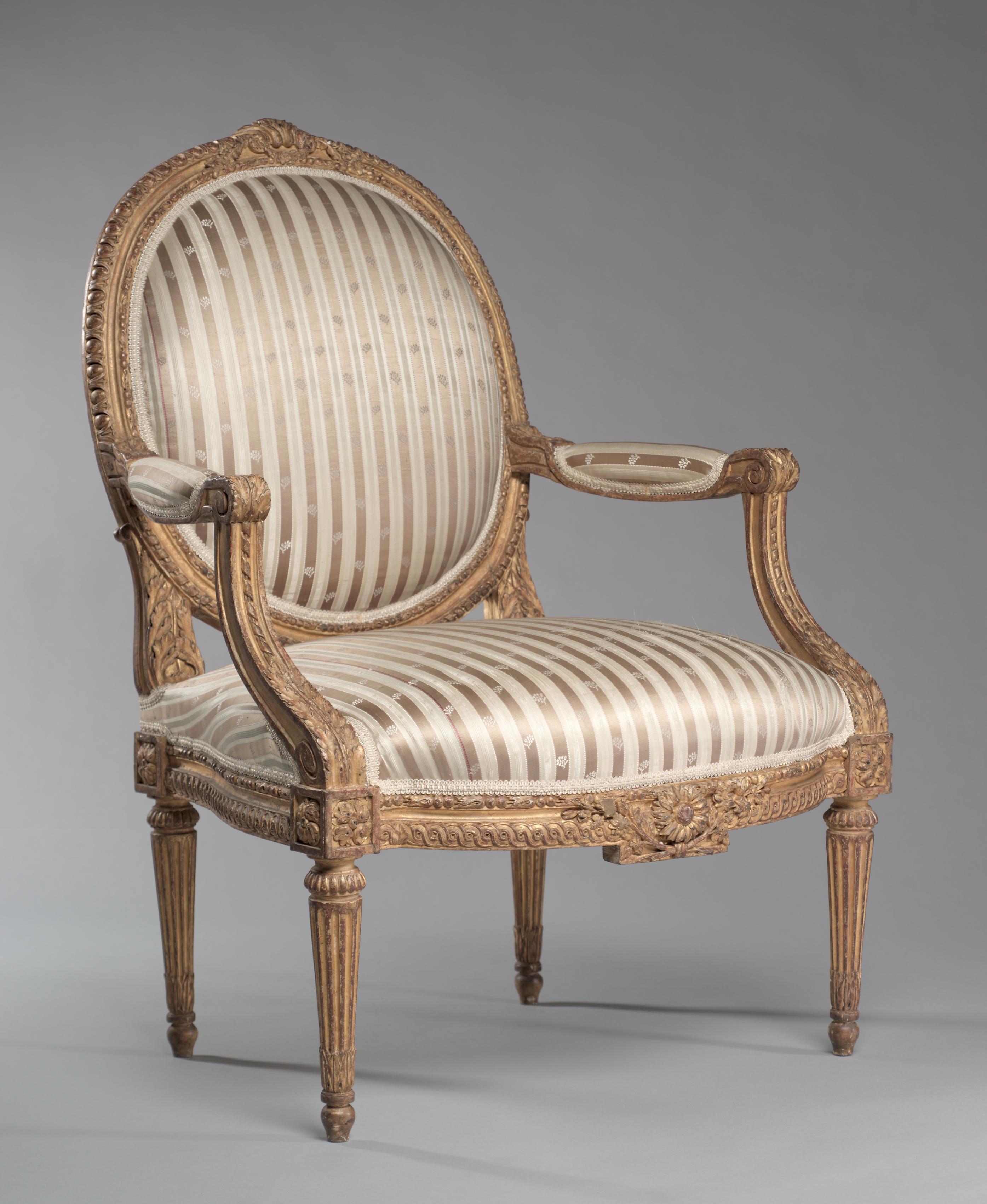 Gold-colored wooden chair with oval back, rounded arms, and four tapered legs. The frame is carved with floral patterns and other designs. The seat and back are upholstered in fabric with thin white and gold stripes and small white floral patterns. The chair is positioned at an angle with the back to the left. The background is a gradient from dark gray at the top to light gray at the bottom.
