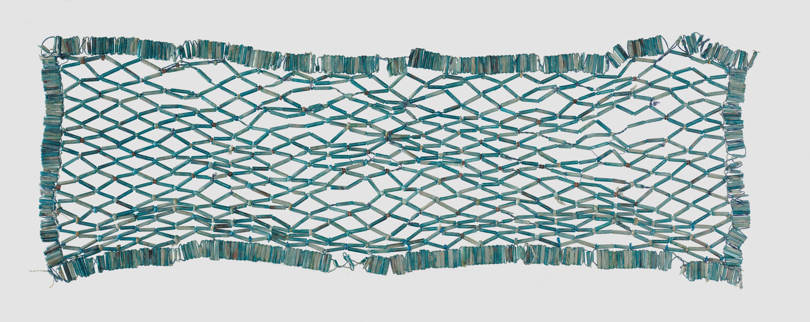 Turquoise faience bead net by Toots Zynsky. The rectangular faience bead net features turquoise and white cylindrical beads arranged in a diamond-shaped open-weave pattern. The net has a wavy edge with beads along the top and bottom, and loose threads are visible on the left side. The beads are predominantly turquoise and white, with a few beads displaying subtle hints of brown and yellow. The faience beads exhibit variation in color and texture. The background of the image is gray.