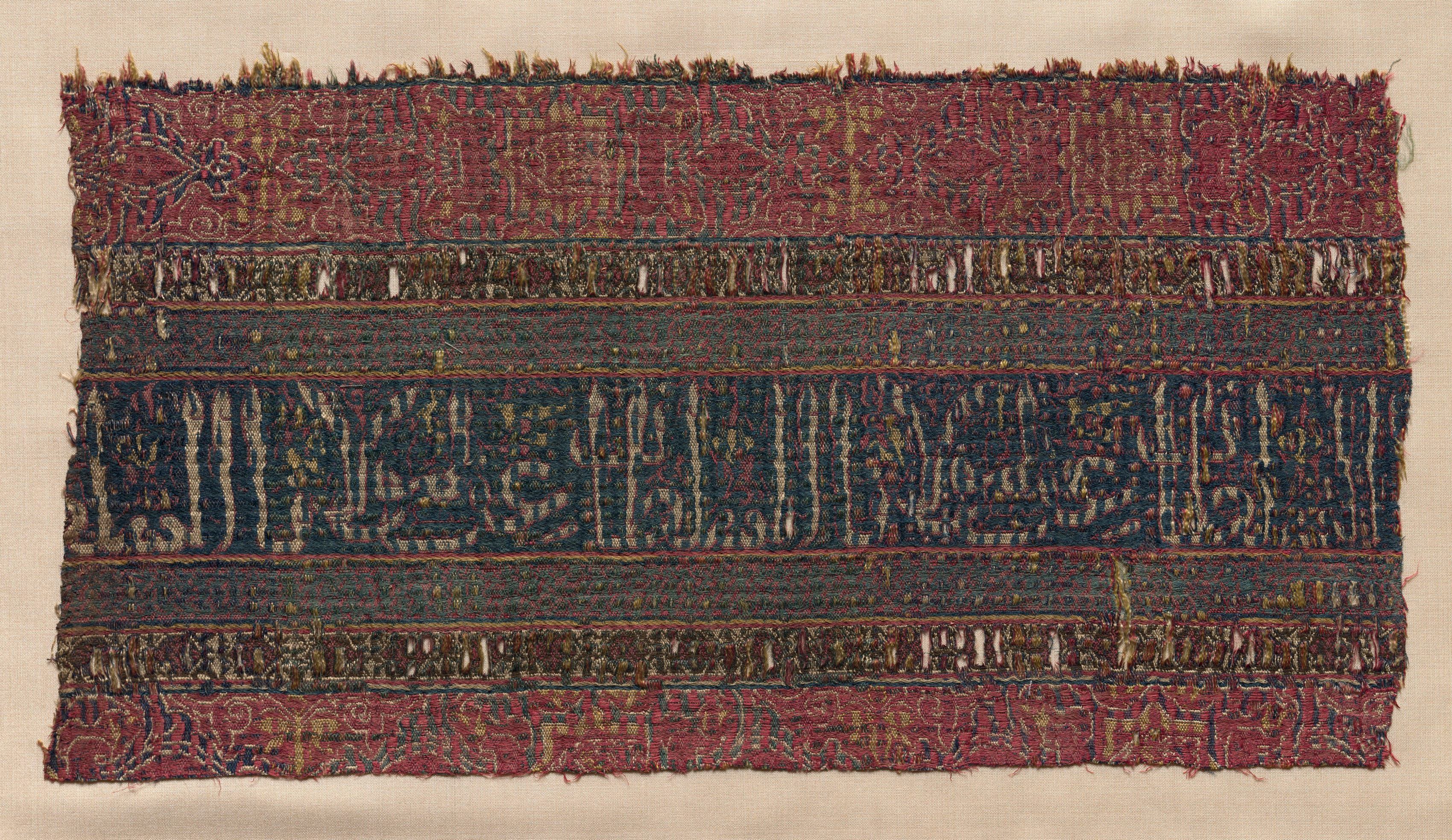 Silk Fragment by unknown artist. Rectangular piece of fabric with frayed top edge, featuring horizontal stripes. Top and bottom stripes are red with intricate green, gold, and white designs. Two middle stripes are dark blue-green with white and gold designs. Narrower stripes with intricate designs in shades of brown, green, and gold are between wider stripes. Beige fabric background visible around edges.