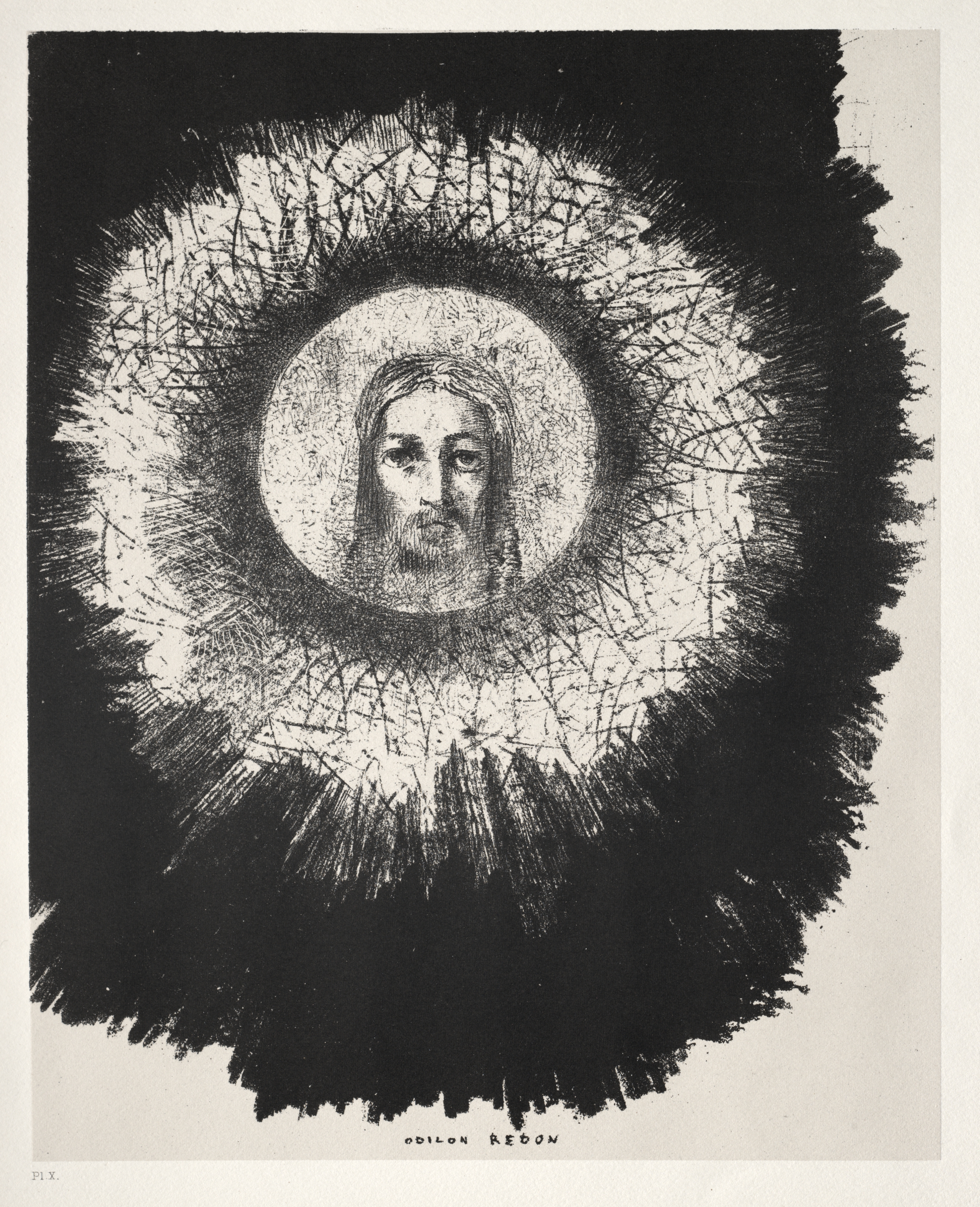 Black and white artwork. Central figure: face of a man with long hair and beard. Circular white halo around the face with radiating lines. Background dark with rough edges. Artist's name at the bottom.