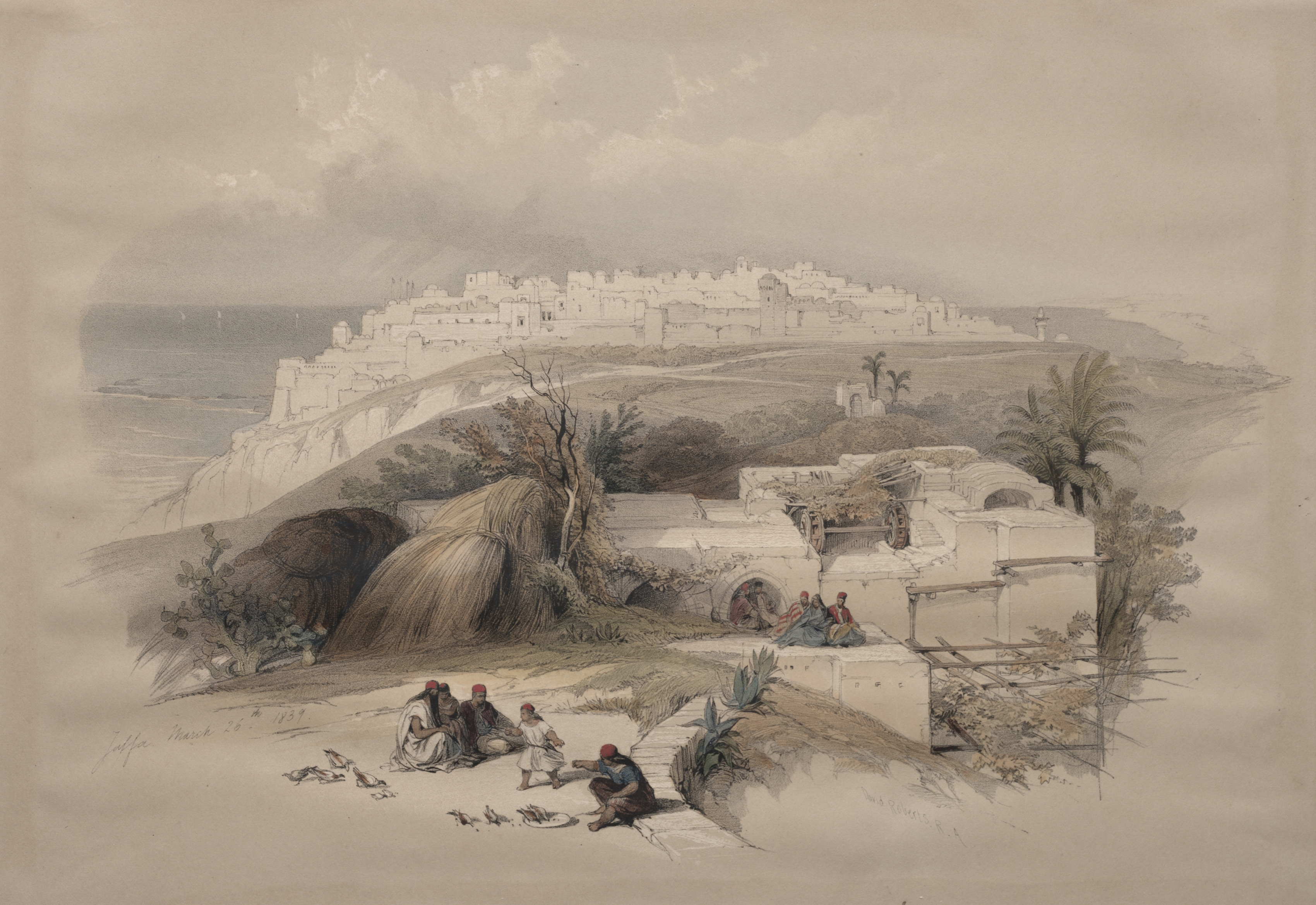 The image depicts a landscape drawing of a city on a hillside. The city is white and situated on top of a hill, with buildings and structures visible. In the foreground, several people wearing red head coverings are sitting on the ground. A body of water is partially visible on the left side behind the hill. Palm trees and other vegetation are scattered throughout the scene. The people in the foreground appear to be engaged in casual activities. The sky above is cloudy. The title of the piece is "Jaffa" and the artist is David Roberts.