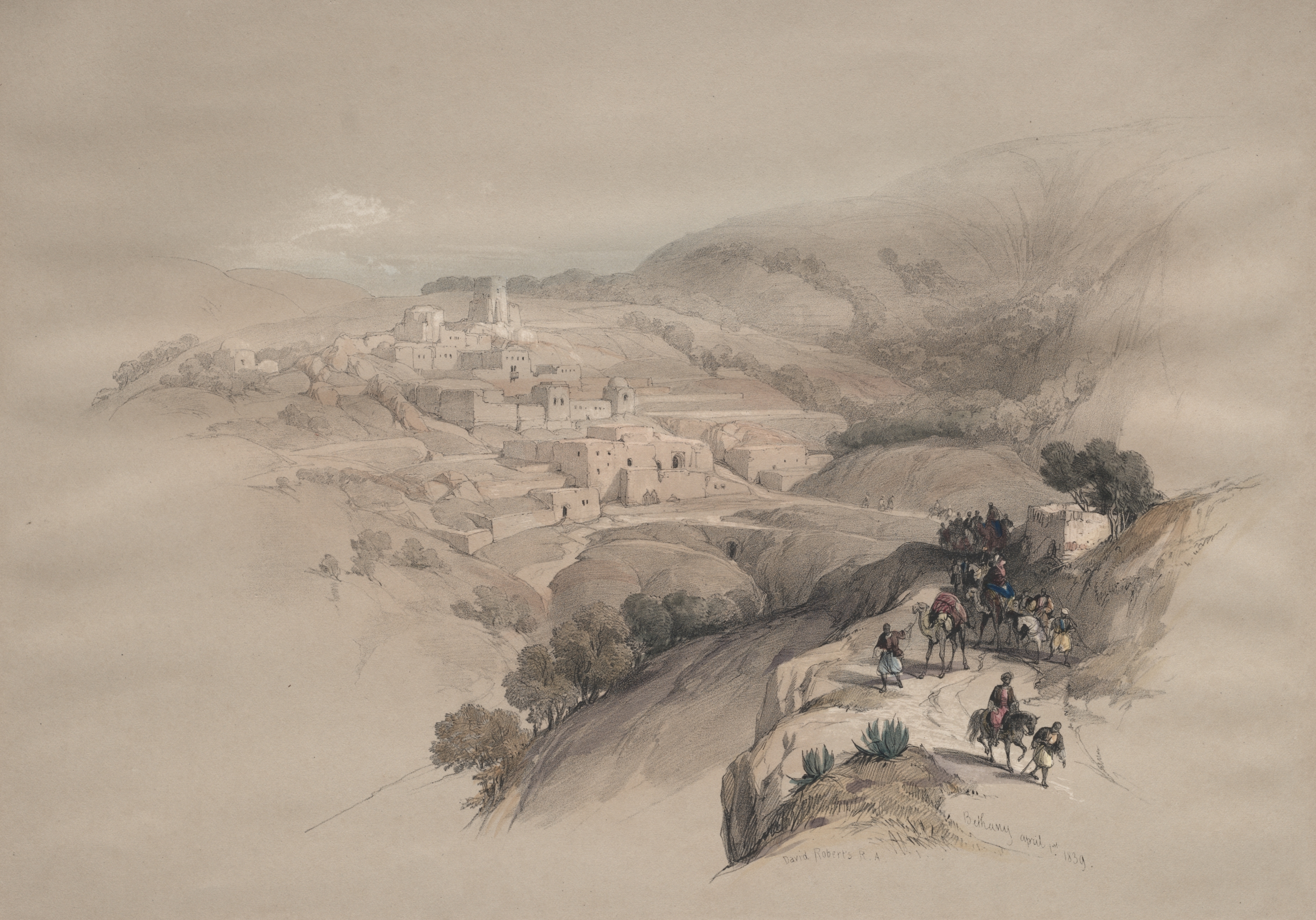 The image depicts a landscape drawing titled 'Bethany' by David Roberts. The scene shows a desert or semi-arid landscape with sparse vegetation. A group of people on camels and horses are prominently featured on a path leading down to a settlement. The settlement, likely representing Bethany, consists of various structures built on a slope. The background features rolling hills and mountains under a cloudy sky. The artwork is rendered in sepia tones, suggesting it might be a lithograph or a similar printmaking technique, given the style and period of David Roberts.