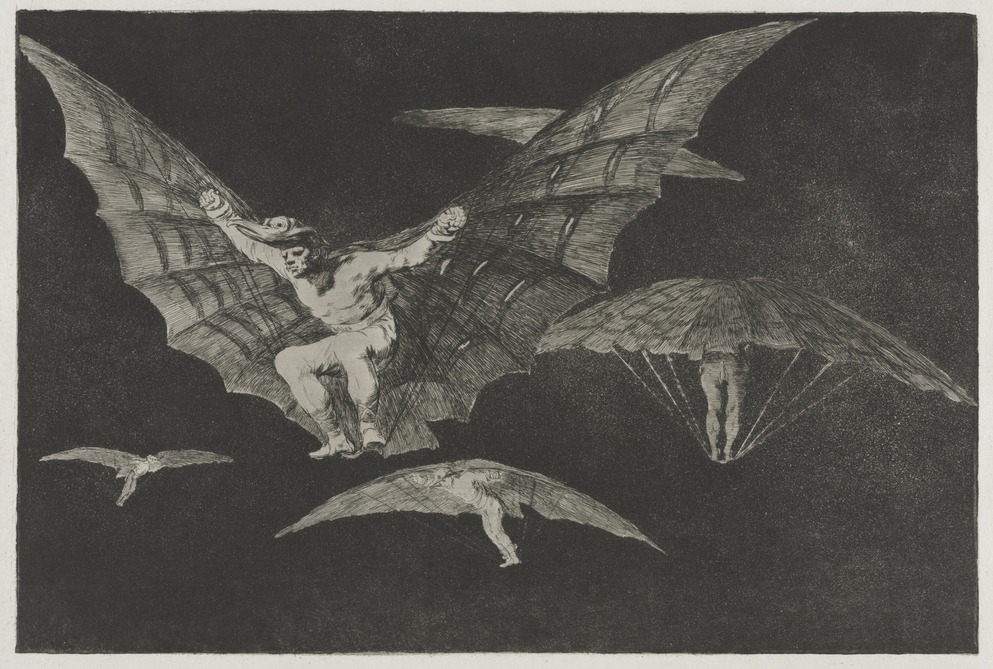 Black and white artwork. A nude man with long hair sits on large bat wings. He holds right arm up in air. Three other figures on parachutes fall down. A small bird flies in bottom left. Dark background. Border around artwork. Title: A Way of Flying. Artist: Francisco de Goya.