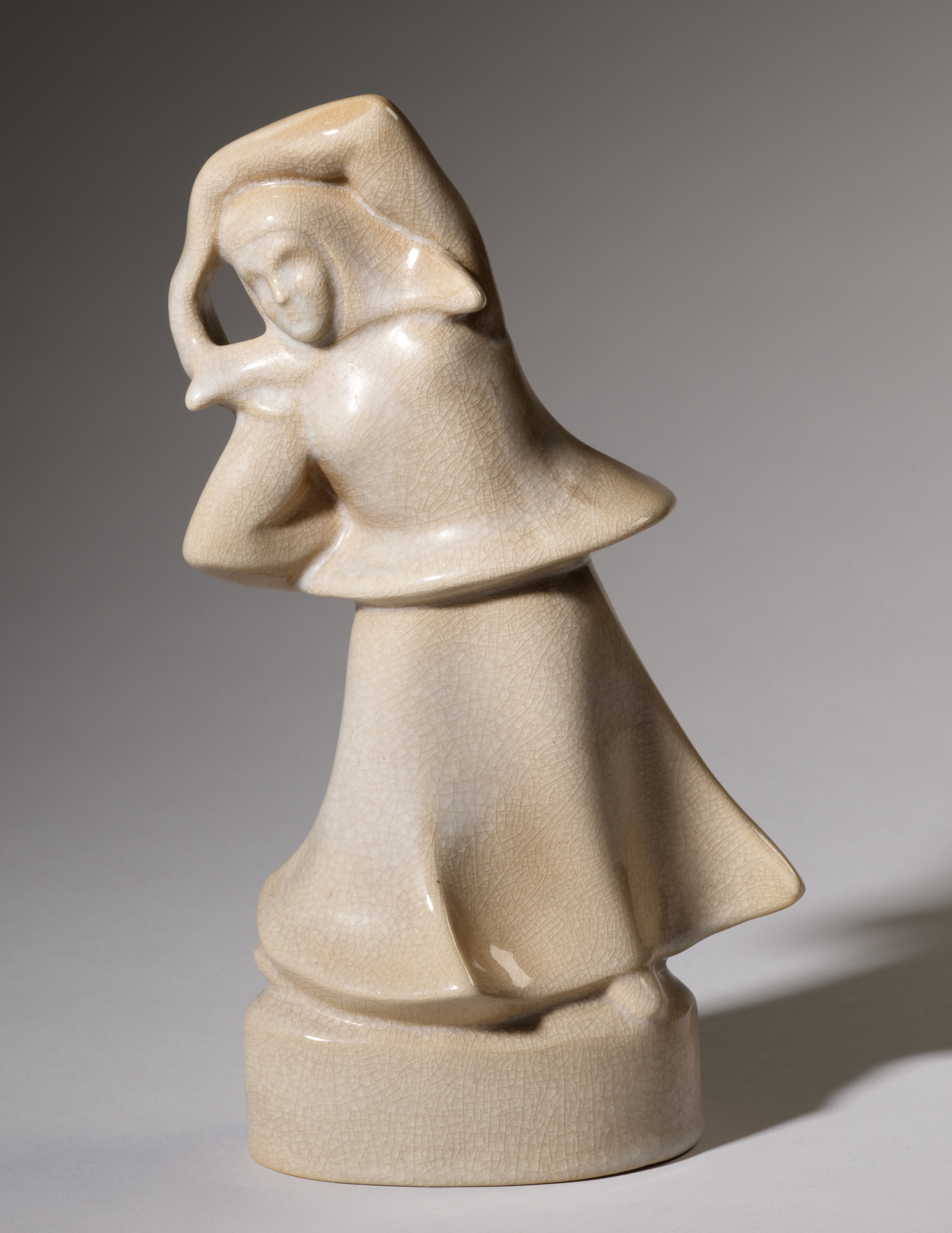 The Dancer by Cowan Pottery Studio. A ceramic sculpture of a woman in a flowing dress. The woman's face is partially obscured. Her right arm is bent at the elbow, with her hand raised to her head. Her left arm is bent at the elbow, with her hand near her chest. The sculpture is beige with a glossy finish and fine cracks throughout. The base is circular and flat. A shadow falls to the right of the sculpture. The background fades from dark gray at top to light gray at bottom.