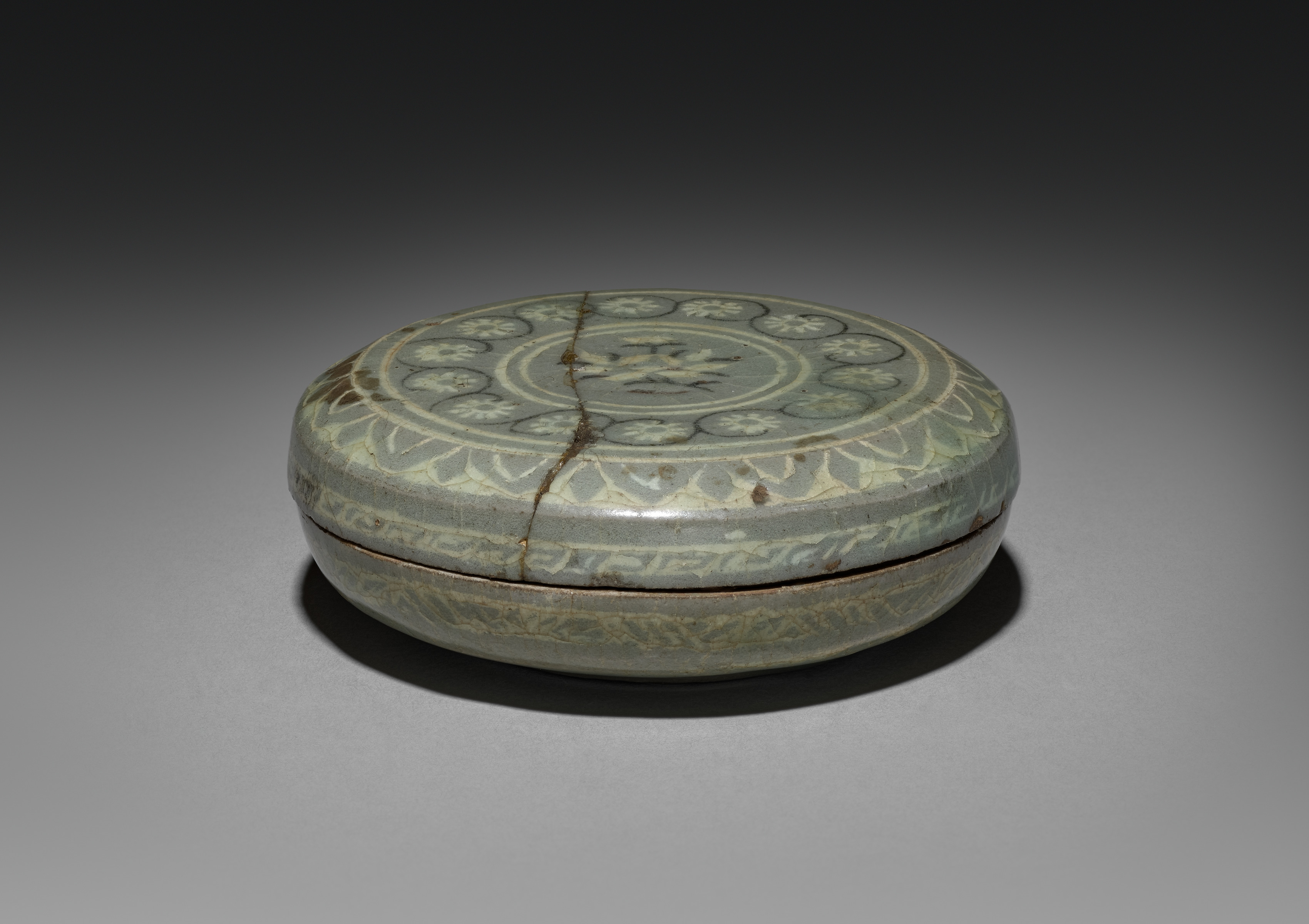 Round, light blue-green ceramic box with a matching lid, featuring a floral pattern. The box and lid have a crack running down the center. The lid has a circular design with a chrysanthemum in the center, surrounded by two concentric circles with a repeating pattern of small flowers. A band of triangular shapes and a scrolling floral motif encircles the lid. The box has a band of scrolling floral motifs around the bottom. The background is a gradient from dark gray at the top to light gray at the bottom. The box is by artist unknown, titled "Box and Cover with Chrysanthemum and Scroll Design".