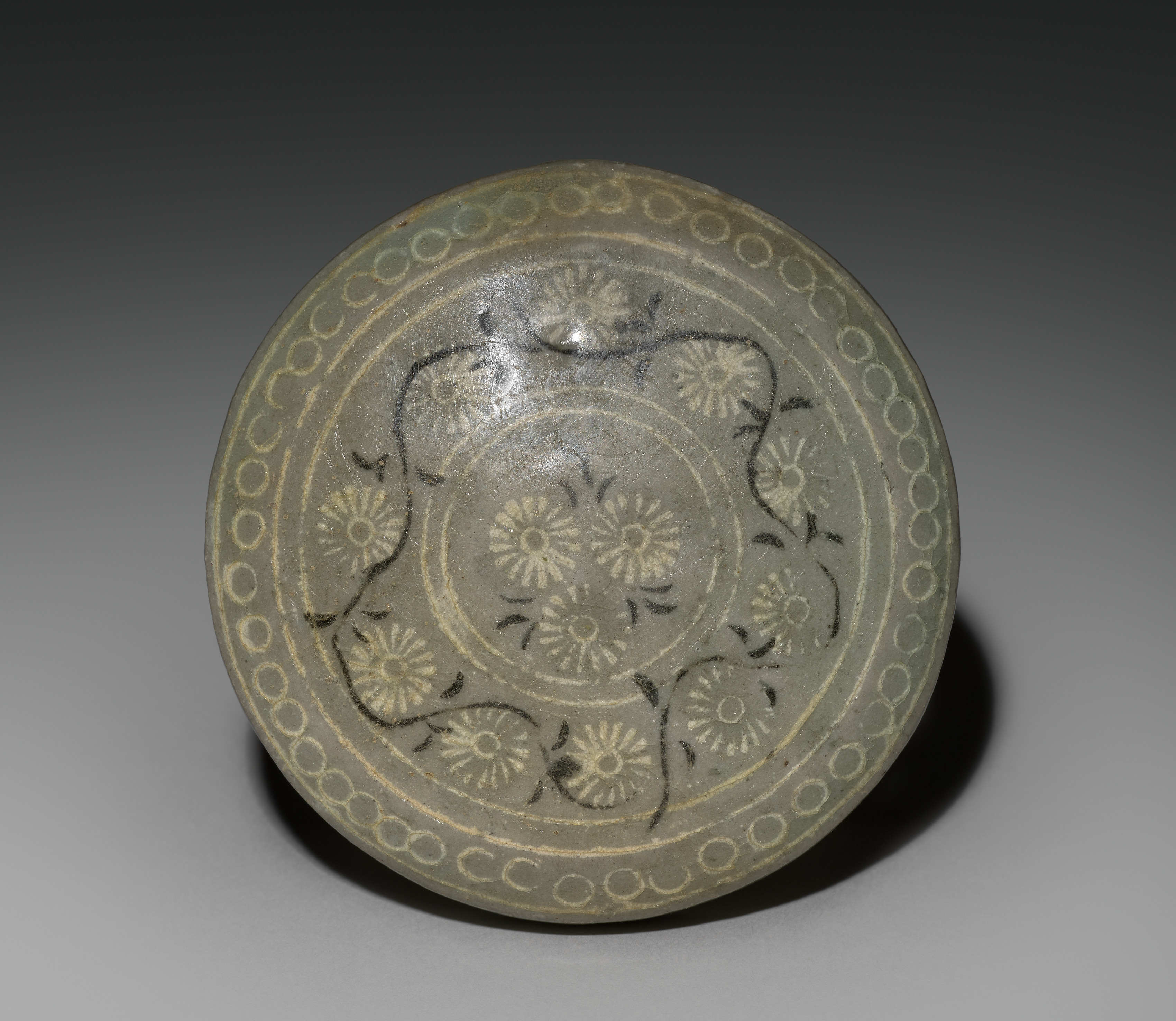 Dish with inscription and decorated with chrysanthemums and rows of dots